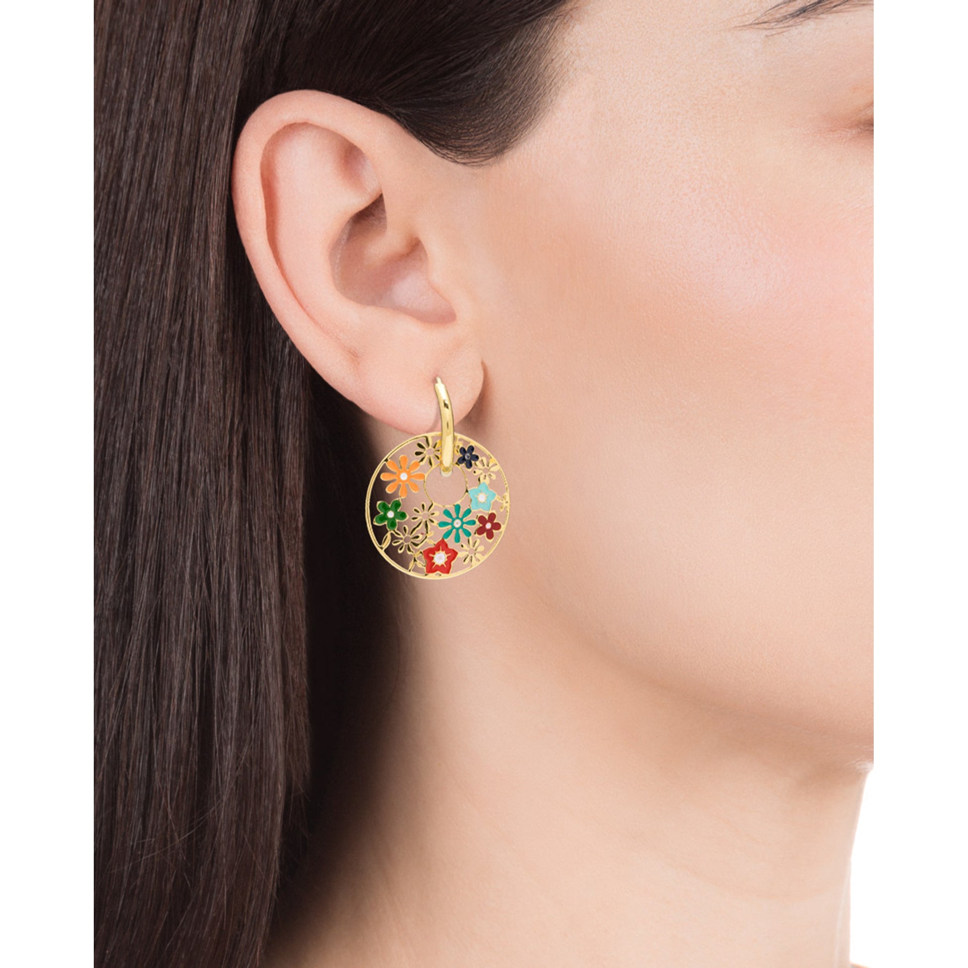 Kiss earrings in gold steel with colorful flower motif