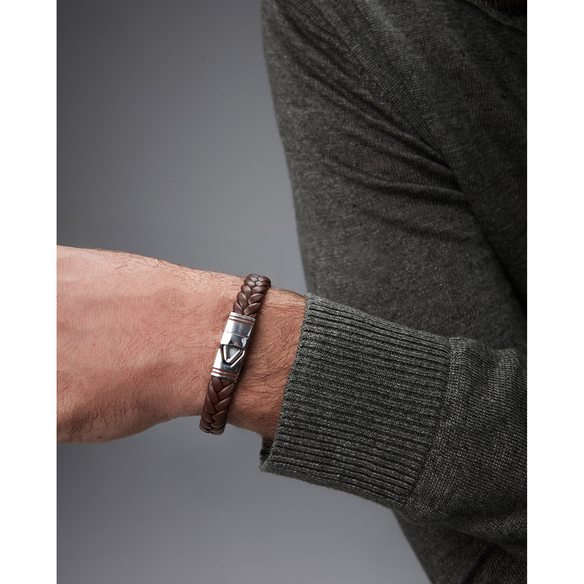 Men's steel and brown braided leather bracelet with brown enamel