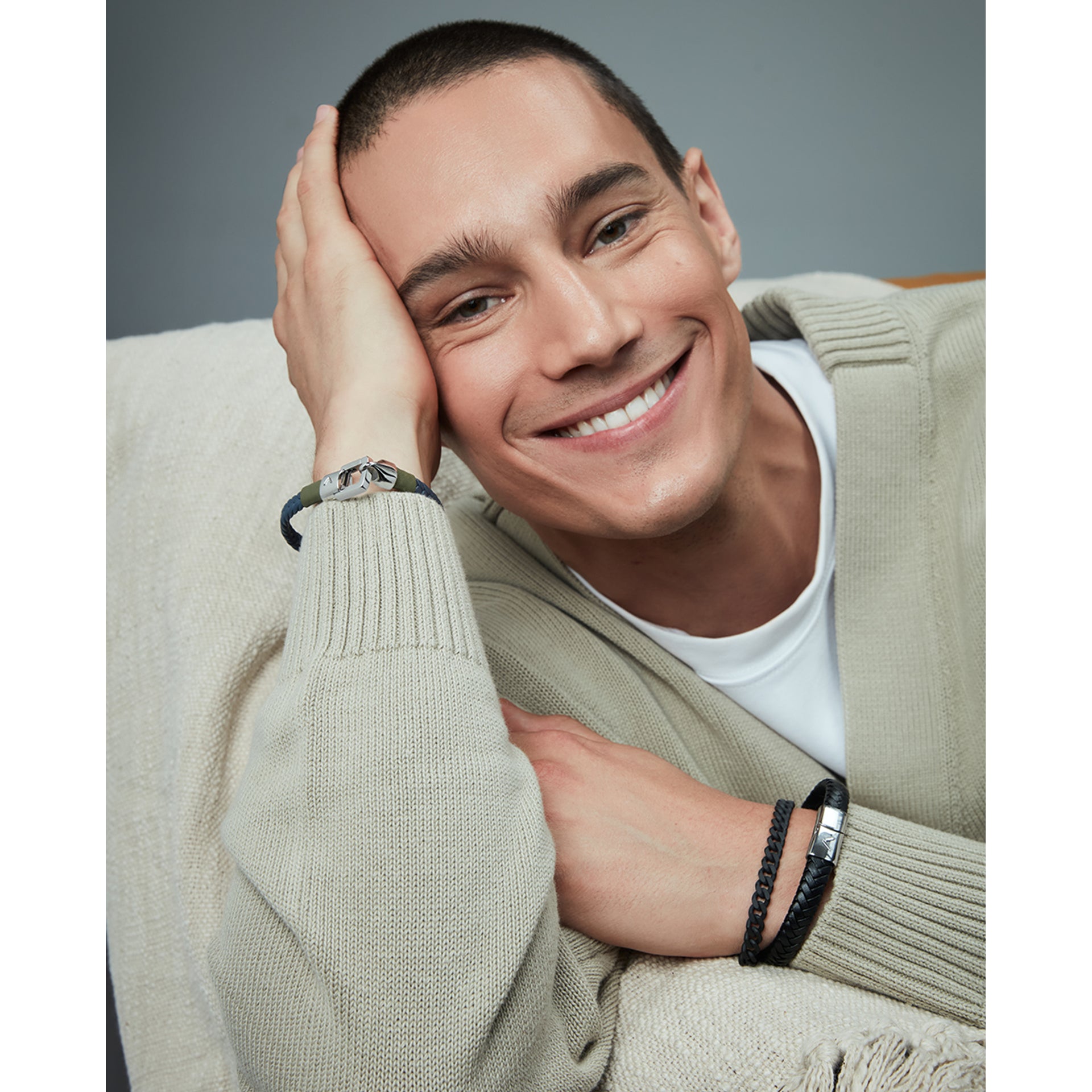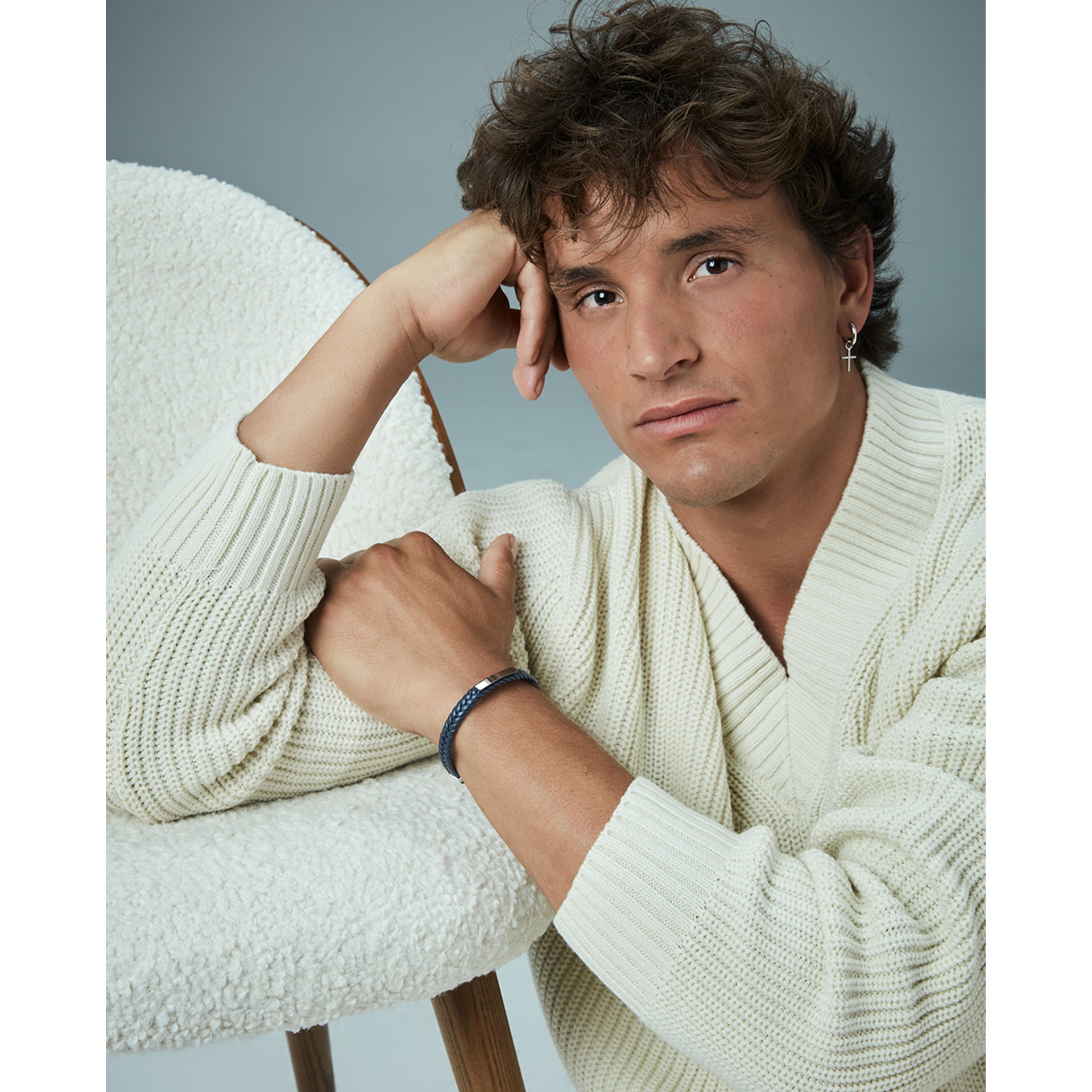 Men's gray IP steel bracelet with plaque and blue braided leather