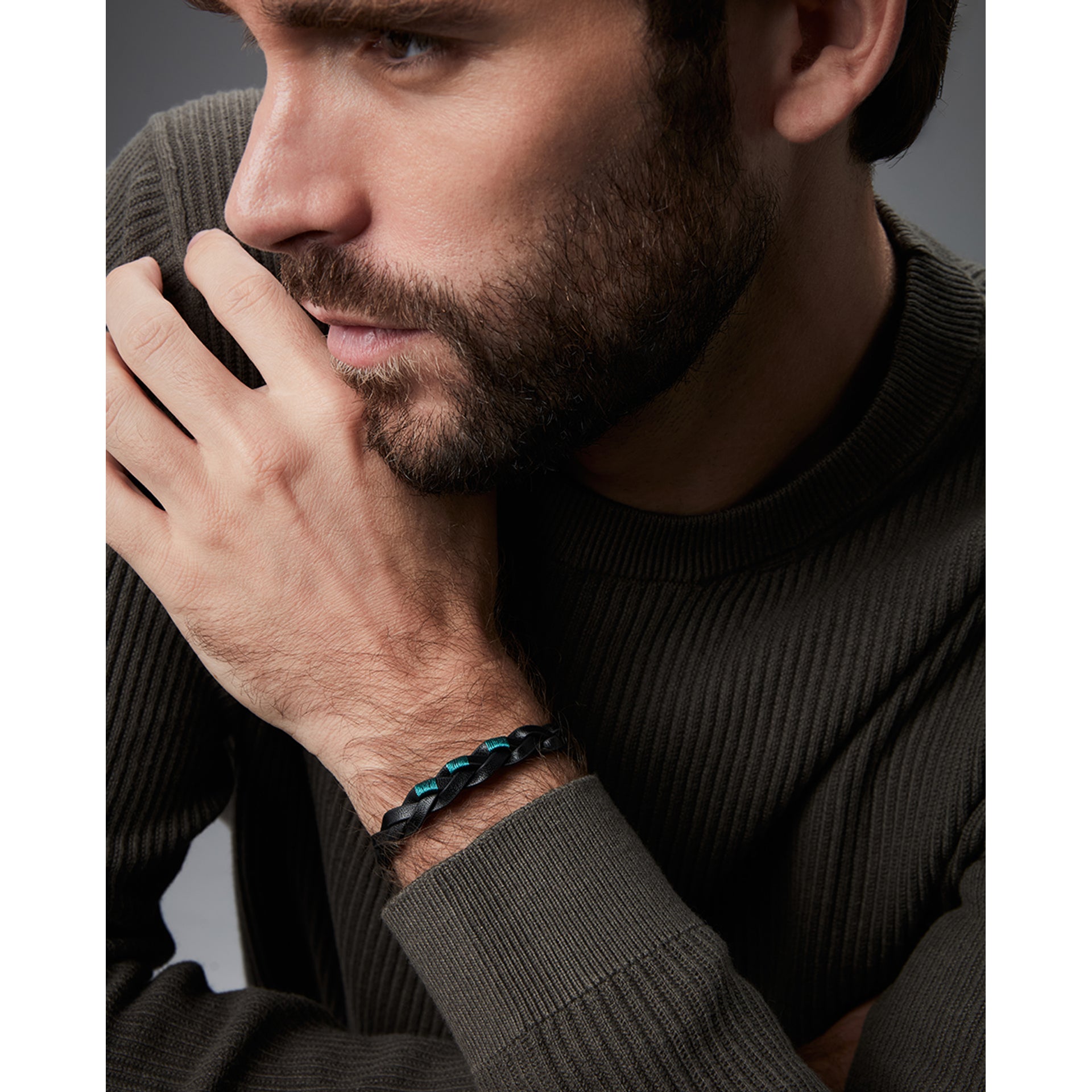 Men's steel and black braided leather bracelet with green cord
