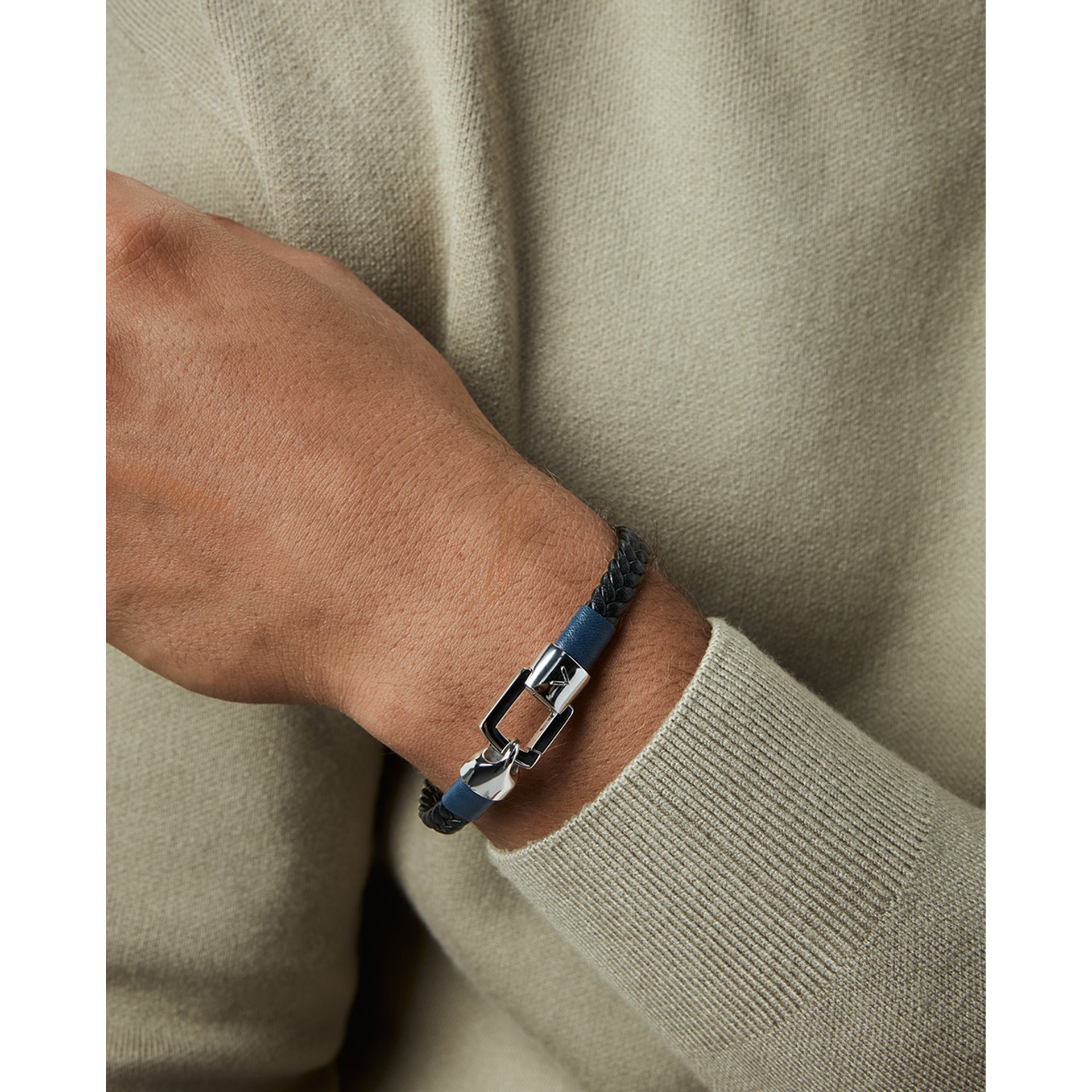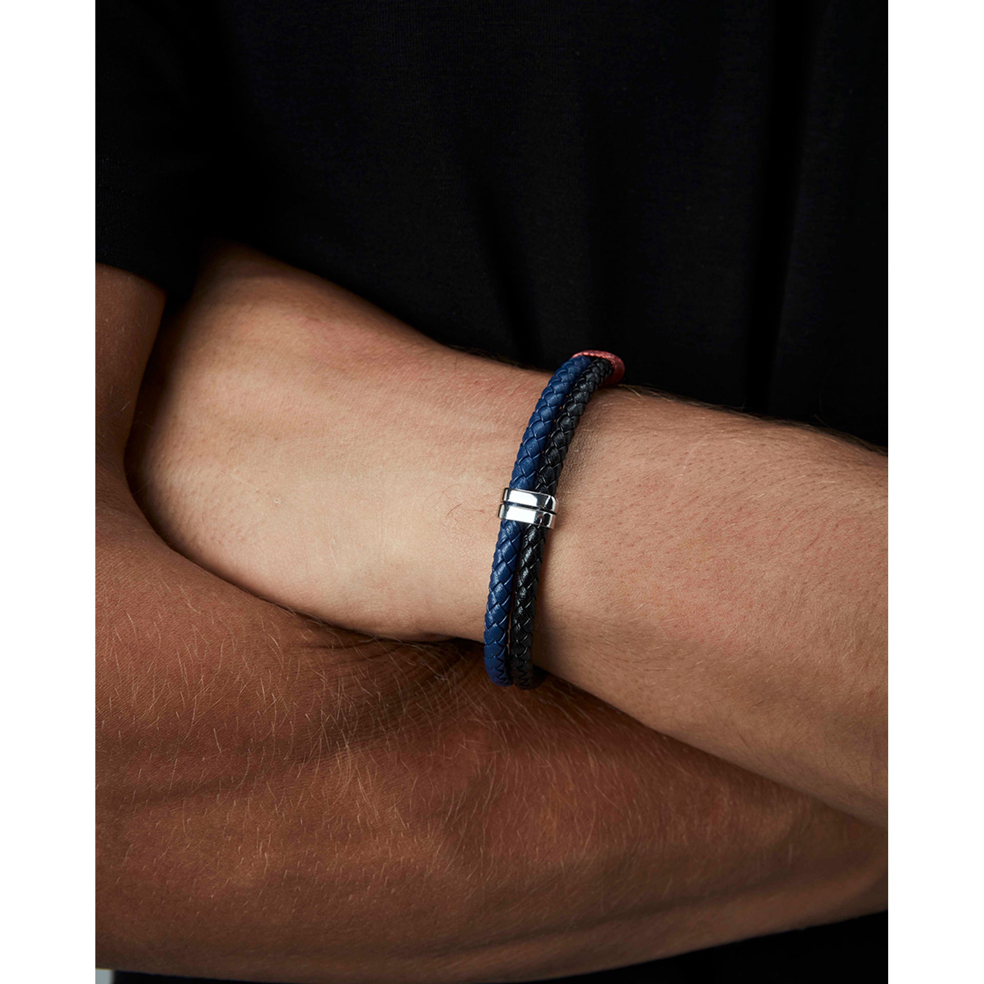 Men's steel and braided blue leather bracelet with blue enamel