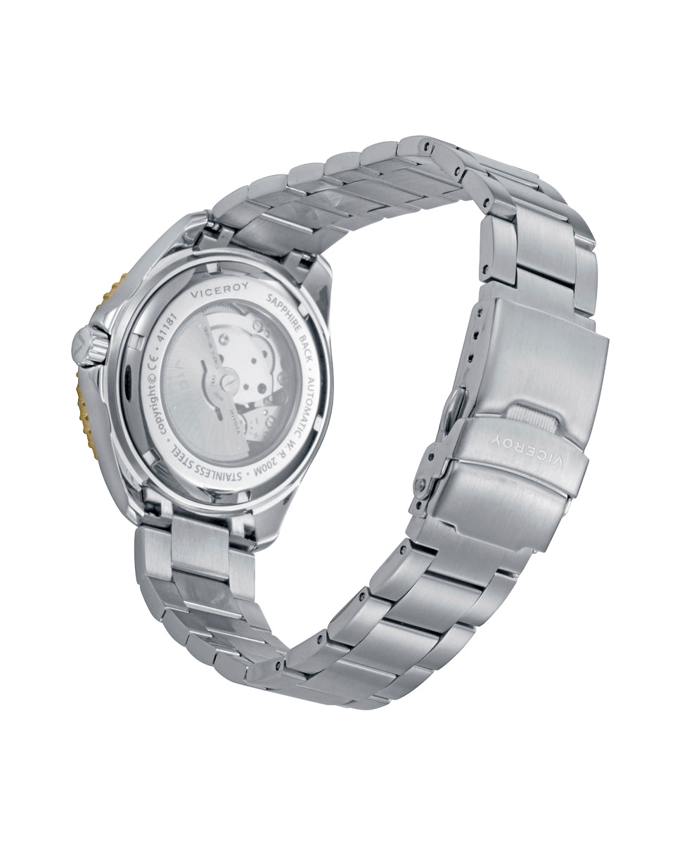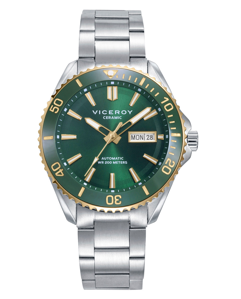 A watch with a bold presence and refined style, designed to fit naturally both formal occasions and everyday wear. Its steel case is paired with a green ceramic bezel and IP gold-tone details, creating an elegant, contemporary contrast. The green dial adds visual depth, while the IP gold-tone hour hands enhance its sophisticated character. The solid steel bracelet adds strength and a flawless finish, and its automatic mechanical movement with date reflects the truest essence of watchmaking. It also features mineral crystal, a screw-down case back and 20 ATM water resistance, offering a piece that is as distinguished as it is functionalProduct Info
