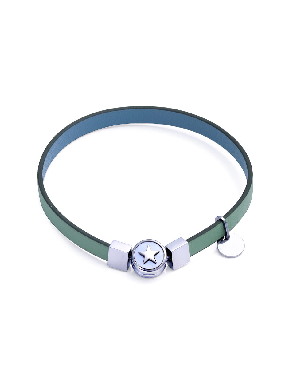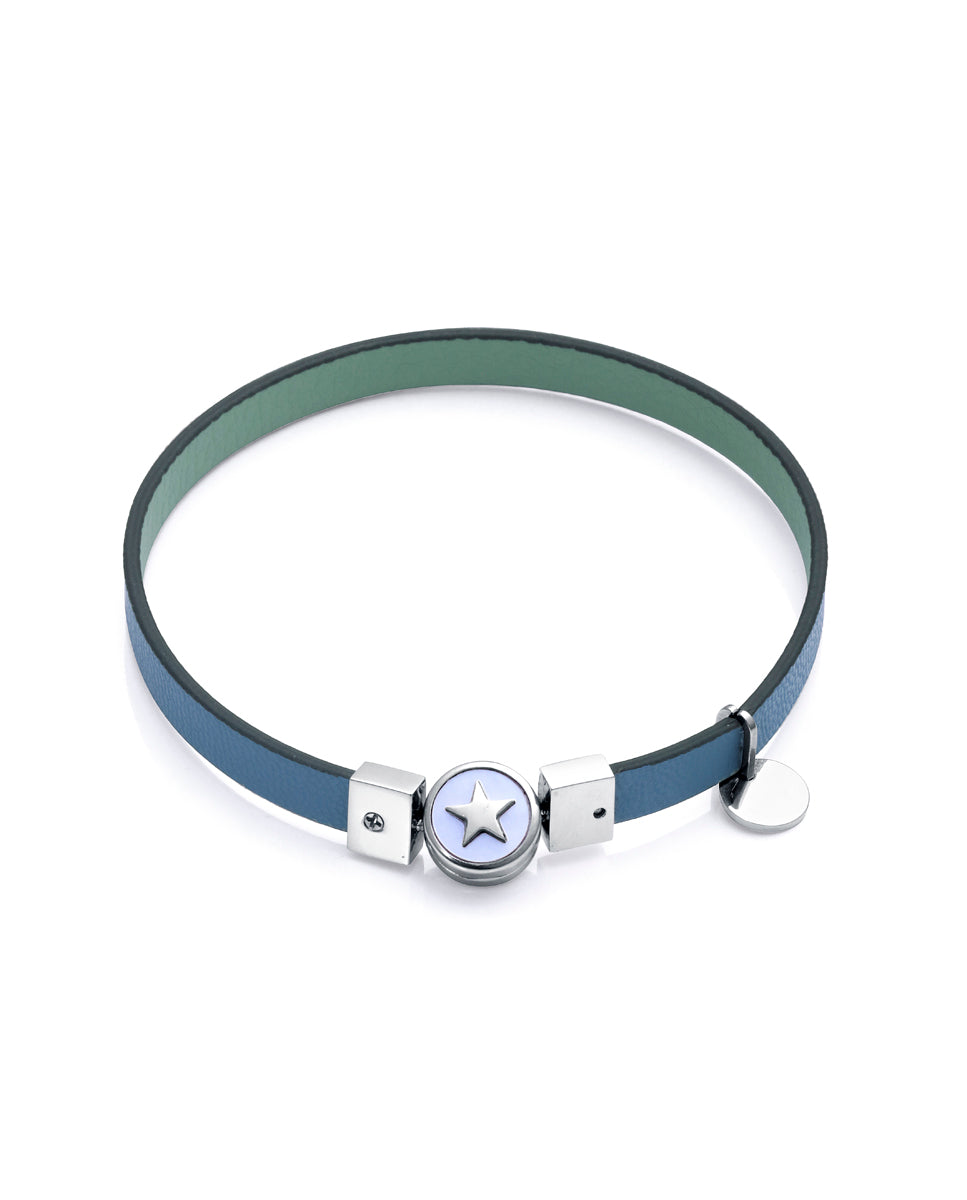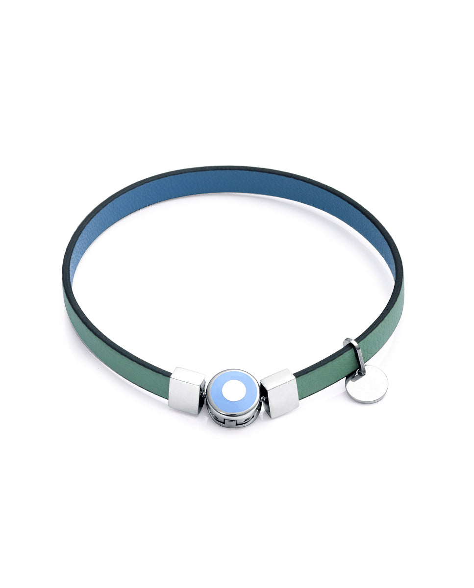 Recycled steel Eco bracelet with denim blue and green reversible vegan strap