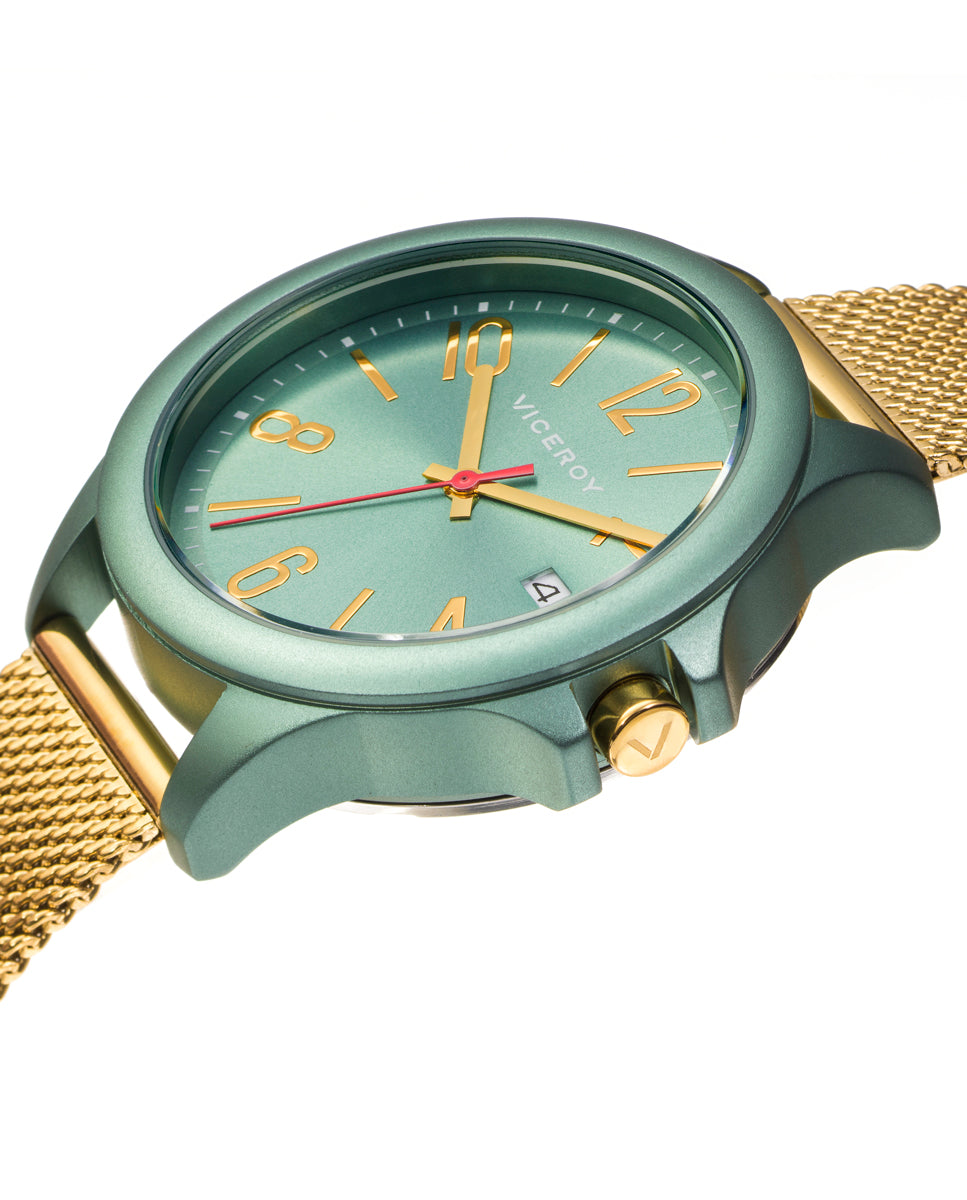 Colors women's watch 3 hands in green aluminum and steel Milanese mesh with gold IP