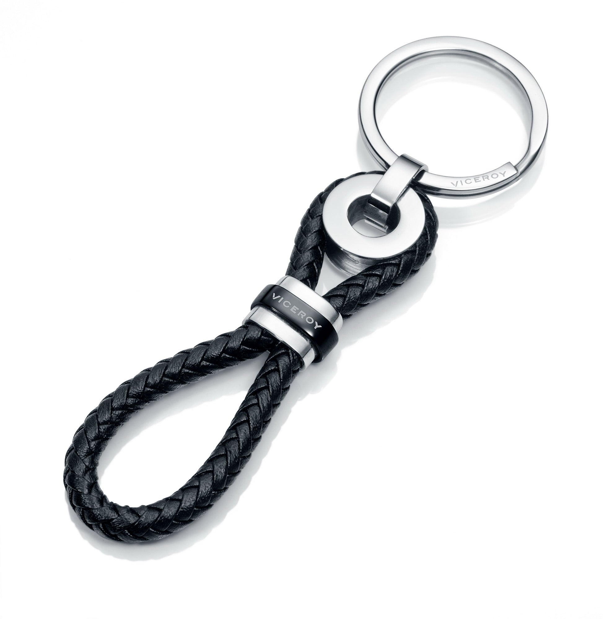 Men's steel and black leather keychain