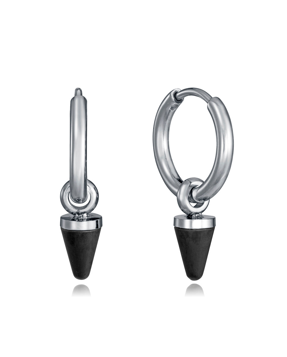 Men's stainless steel earrings with hoop design and black IP cone charm. Contemporary, elegant style, 1.4 cm long