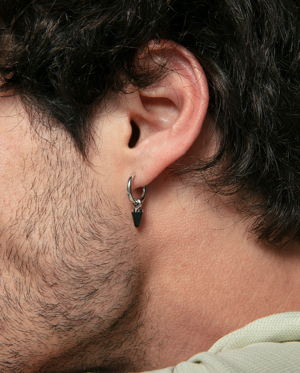 Men's stainless steel earrings designed with a clean, contemporary look that adds character without excess. The hoop style is finished with a cone-shaped charm in black IP, creating a refined, modern contrast. Measuring 1.4 cm in length, they offer a discreet yet distinctive option, ideal for completing urban and sophisticated looksProduct Info