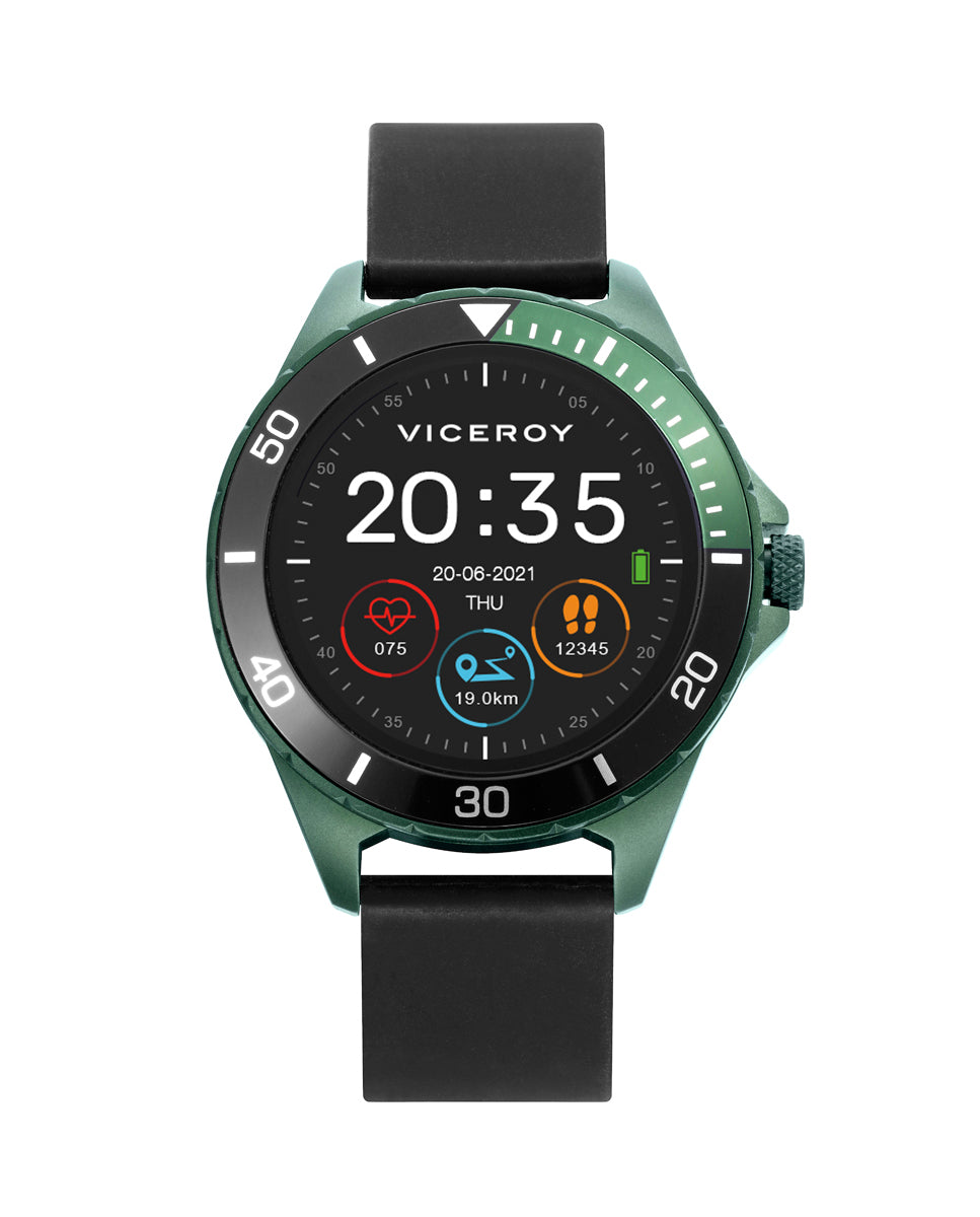Smartpro children's smartwatch with black silicone strap and additional strap with green camouflage print