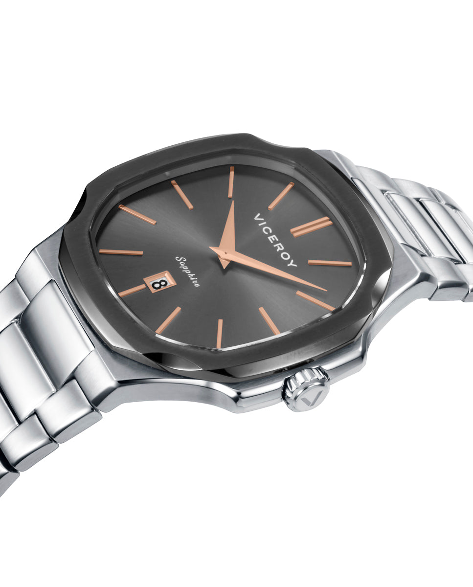 Reloj caja bitono de acero e Ip gris 10 Atm, brazalete de acero movimiento cuarzo, colección Laura Escanes