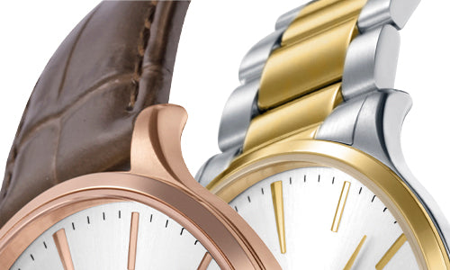 Pink IP 5 ATM steel case watch, brown leather strap, Swiss quartz movement, Swiss made
