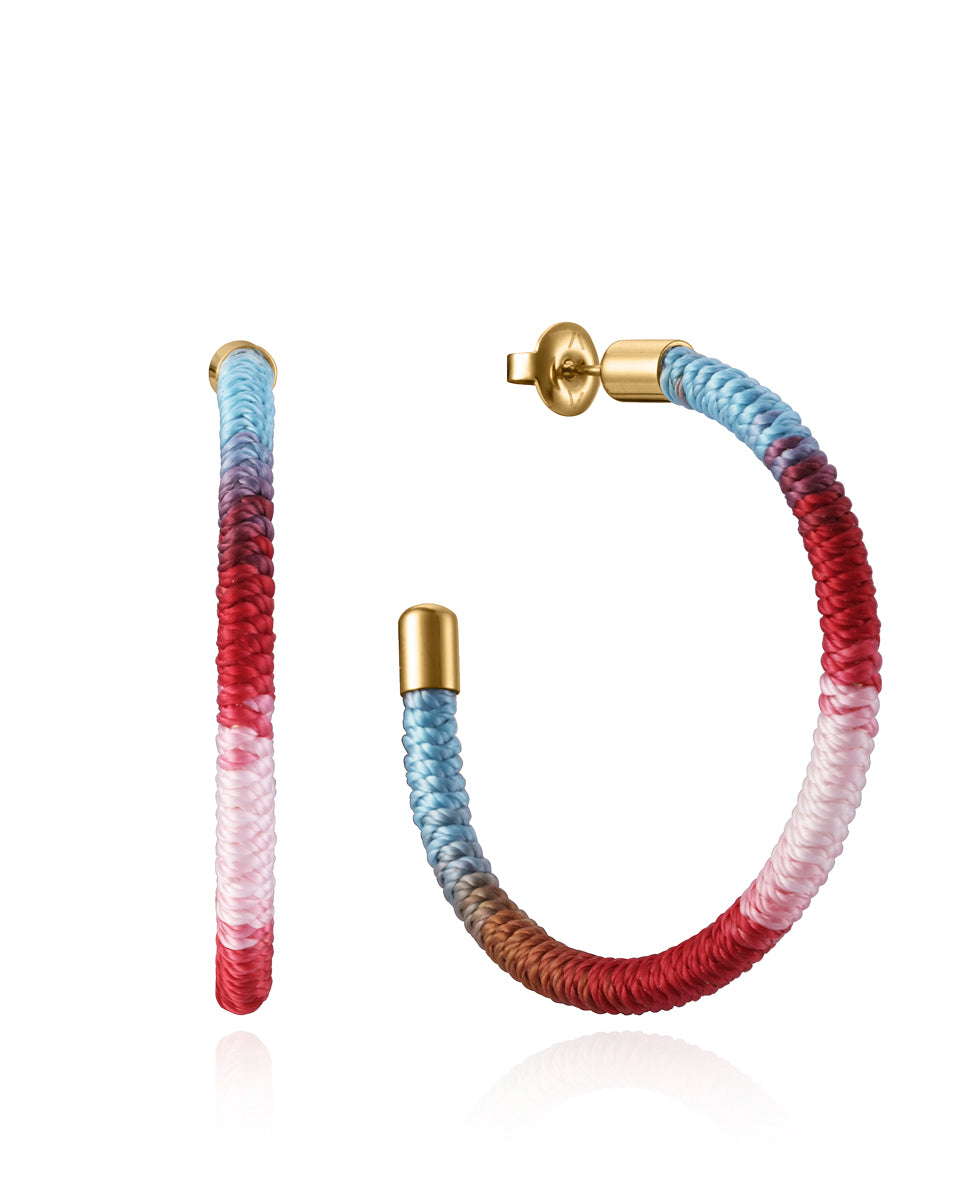 Kiss earrings in gold Ip steel with multicolored cord in red, pink and blue tones