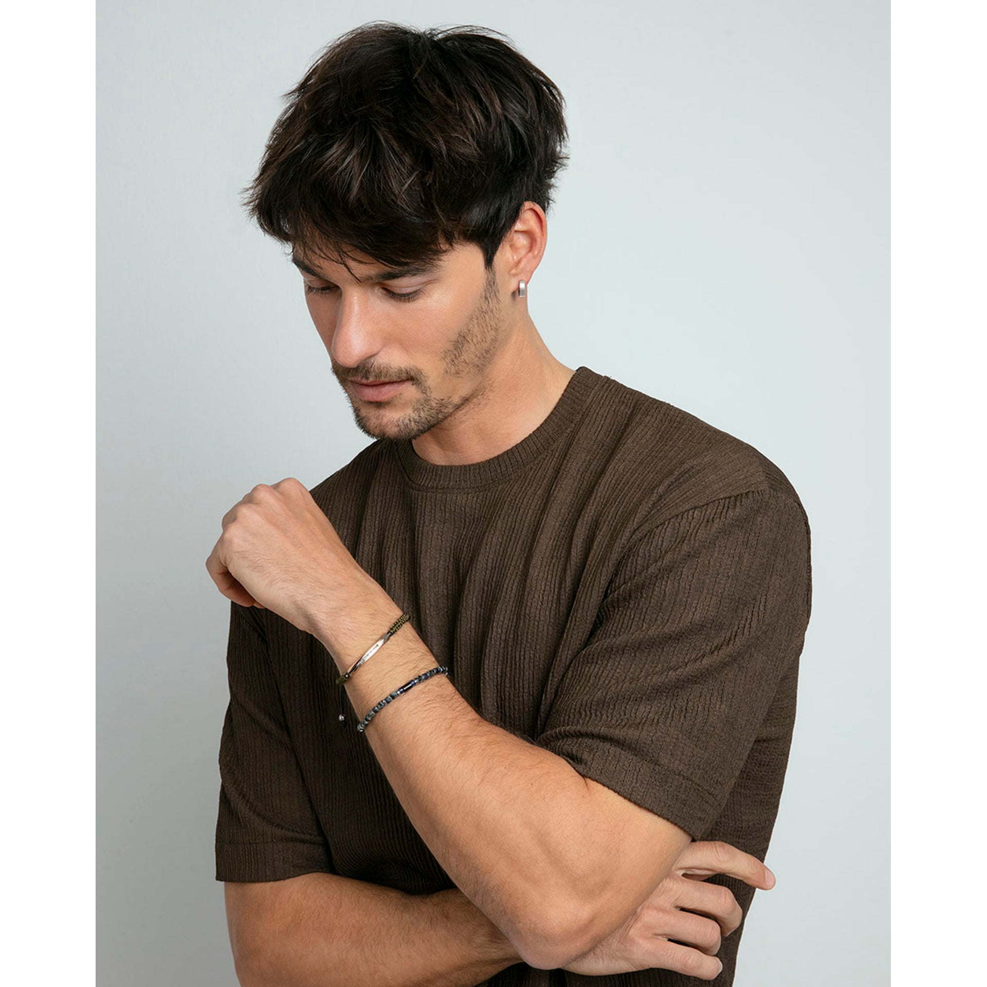 Bracelet homme en acier et cuir tressé marron avec cordon beige