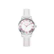 Montre boîtier et bracelet en acier, mouvement à quartz. Bracelet en argent avec cordon rose à motifs coeur cadeau.
