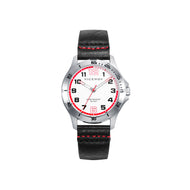 Montre pour enfants avec boîtier et lunette en acier avec indicateurs d'heures bleus. Bracelet en cuir tressé bleu avec plaque d'acier et détails en émail cadeau.