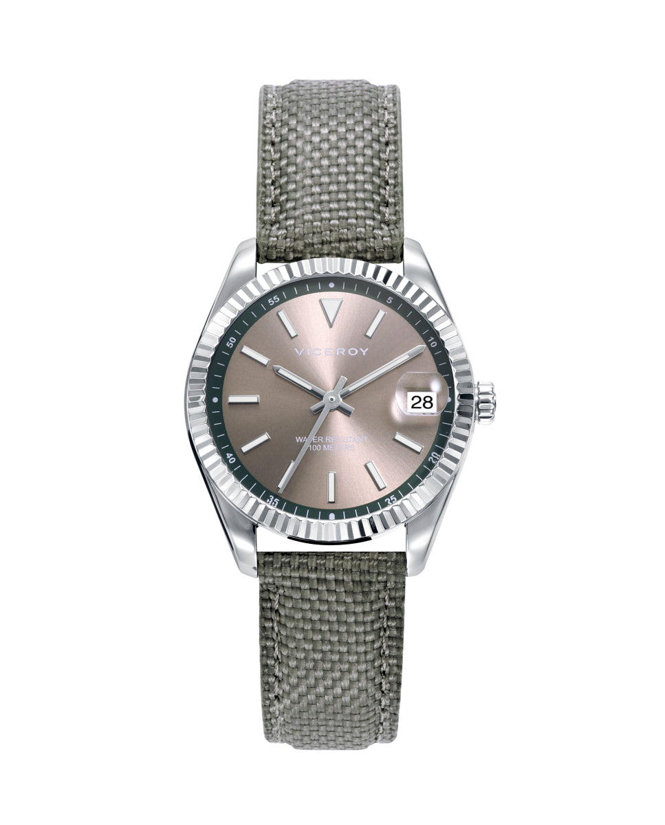 Montre femme chic avec boîtier en acier et bracelet en nylon gris