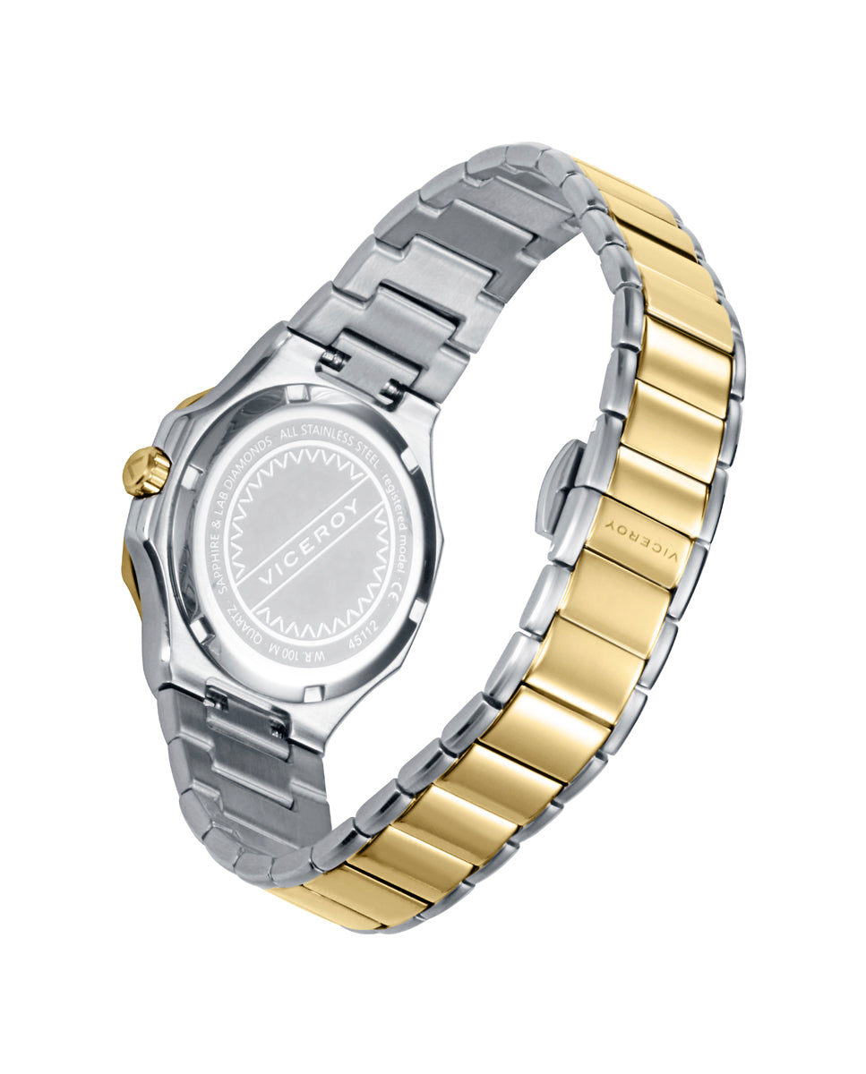 Reloj caja bitono de acerro e Ip dorado 10 Atm, brazalete bitono de acero e Ip dorado,movimiento cuarzo, colección Laura Escanes