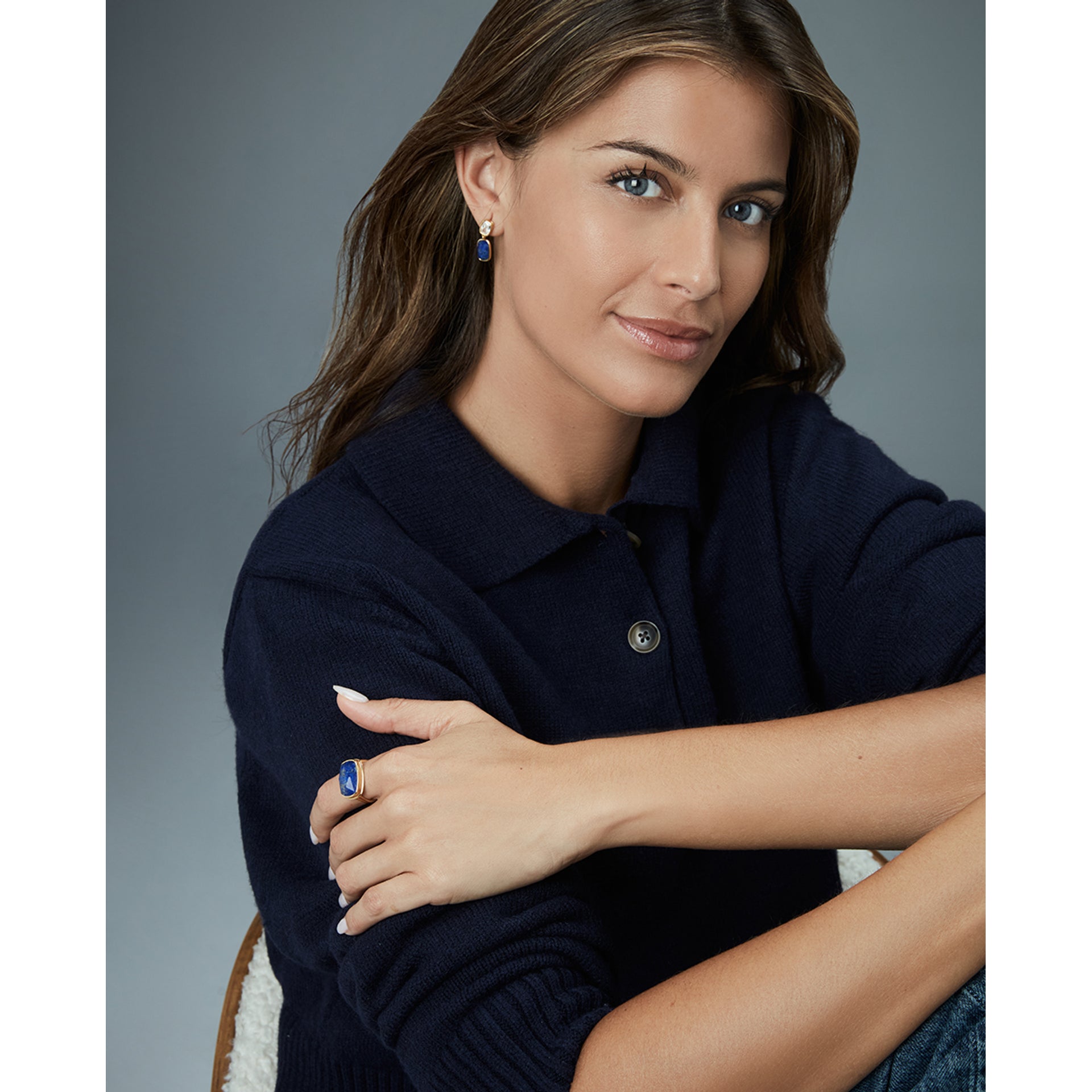 Anillo de plata de primera ley con baño de oro y piedra natural doblete lapiz lazuli y cristal