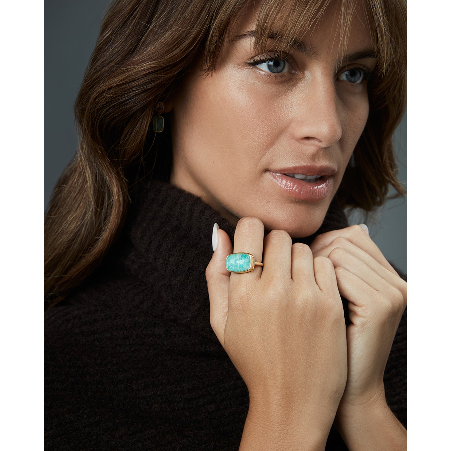 Anillo de plata de primera ley con baño de oro y piedra natural doblete amazonita y cristal
