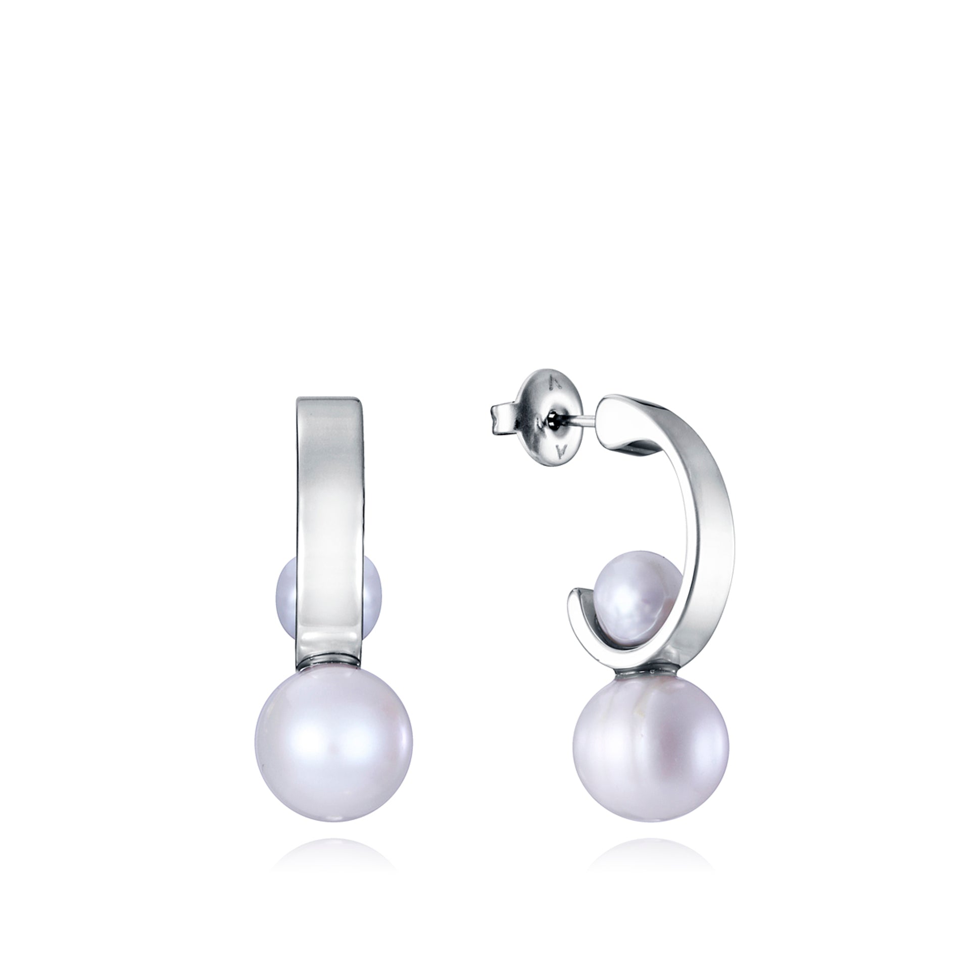 Orecchini in acciaio, cerchio aperto con perle coltivate, da donna, lunghezza 2,7 cm.