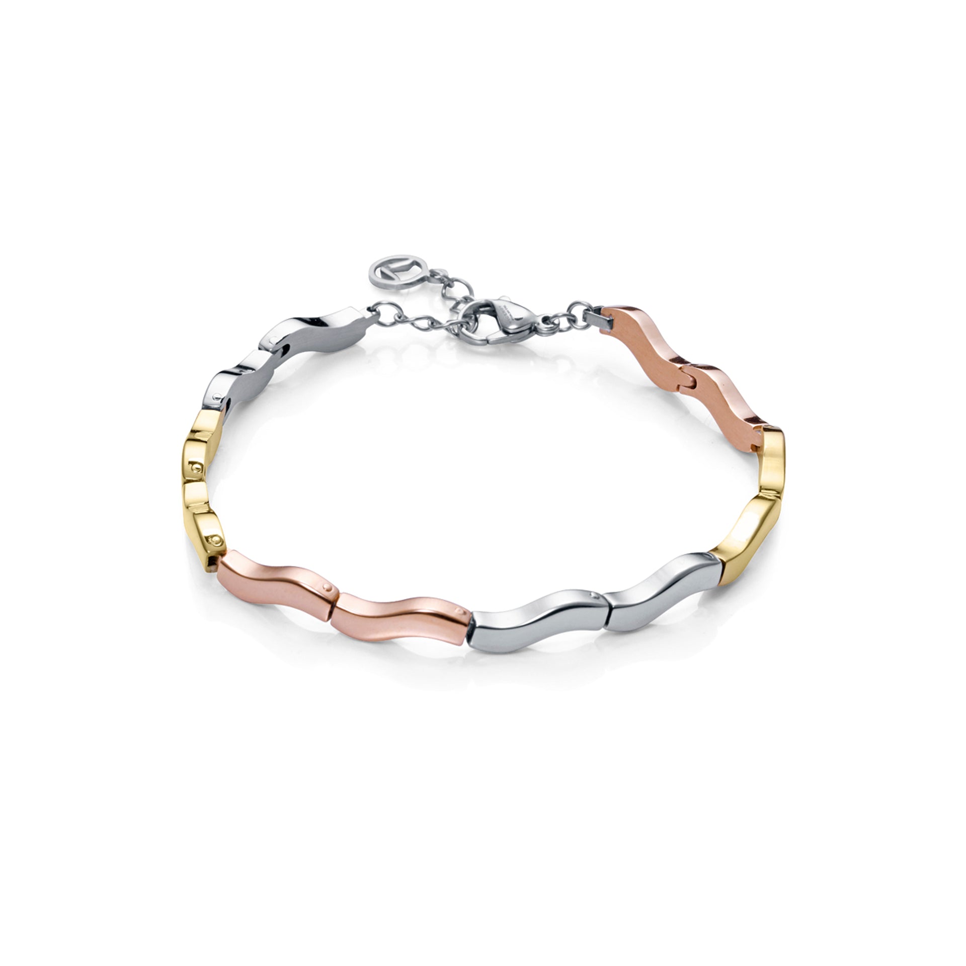 Bracciale in acciaio tricolore con onde in acciaio oro e rosa