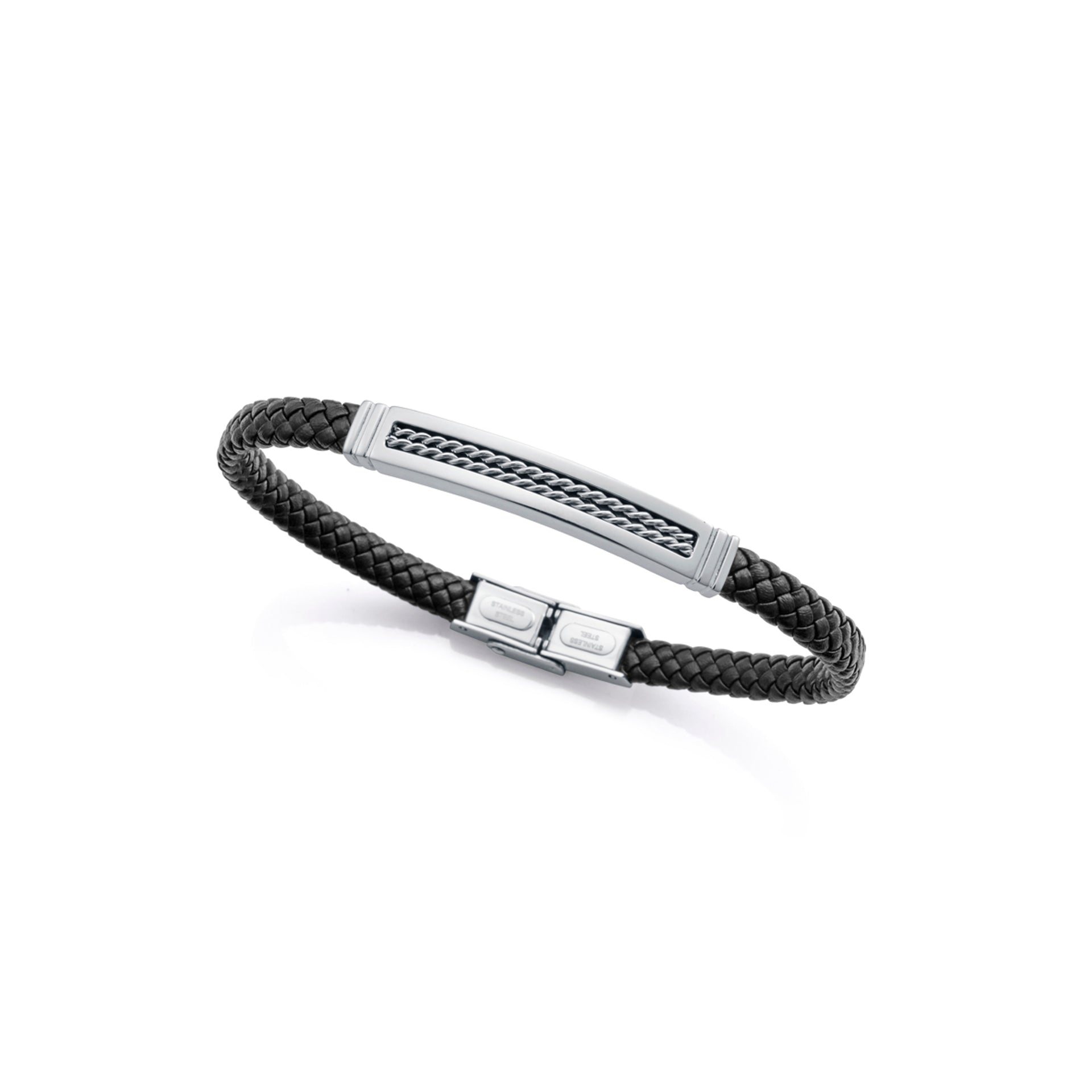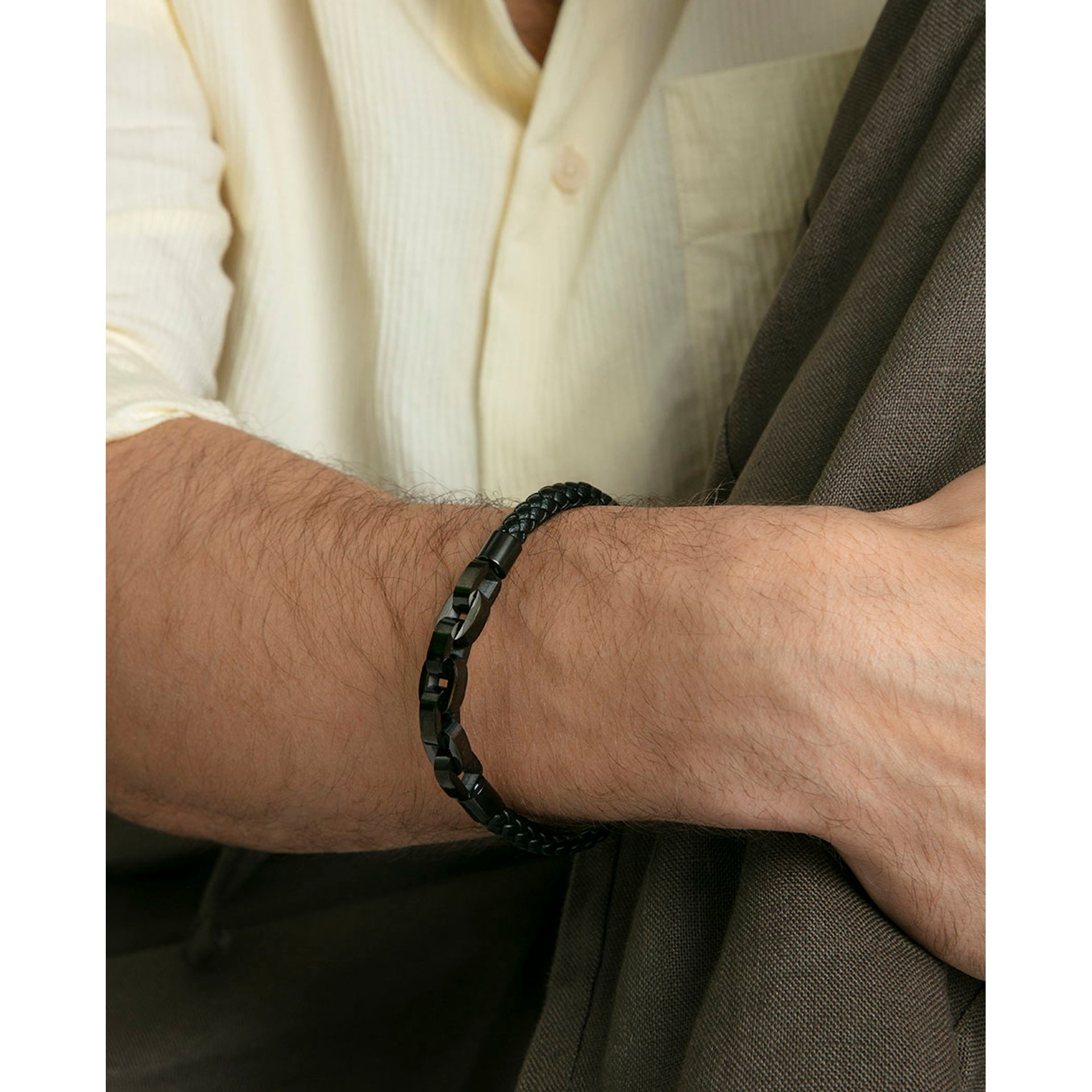 Bracciale da uomo in acciaio Ip grigio e pelle intrecciata nera