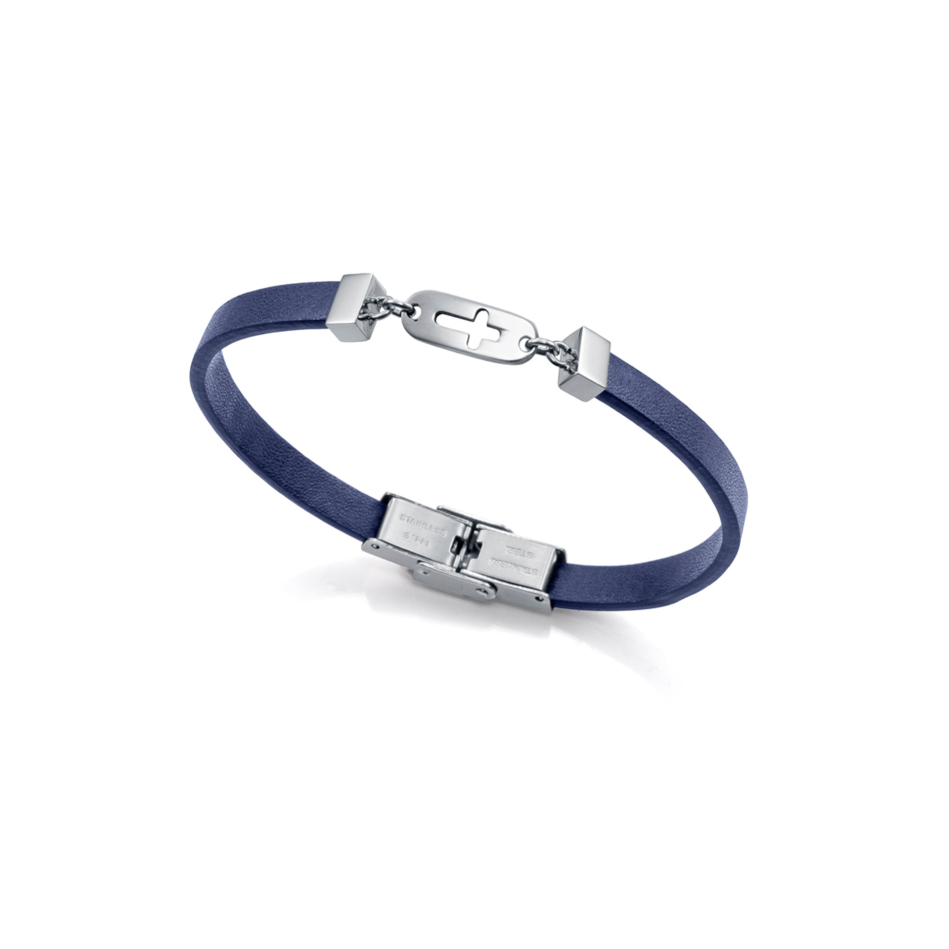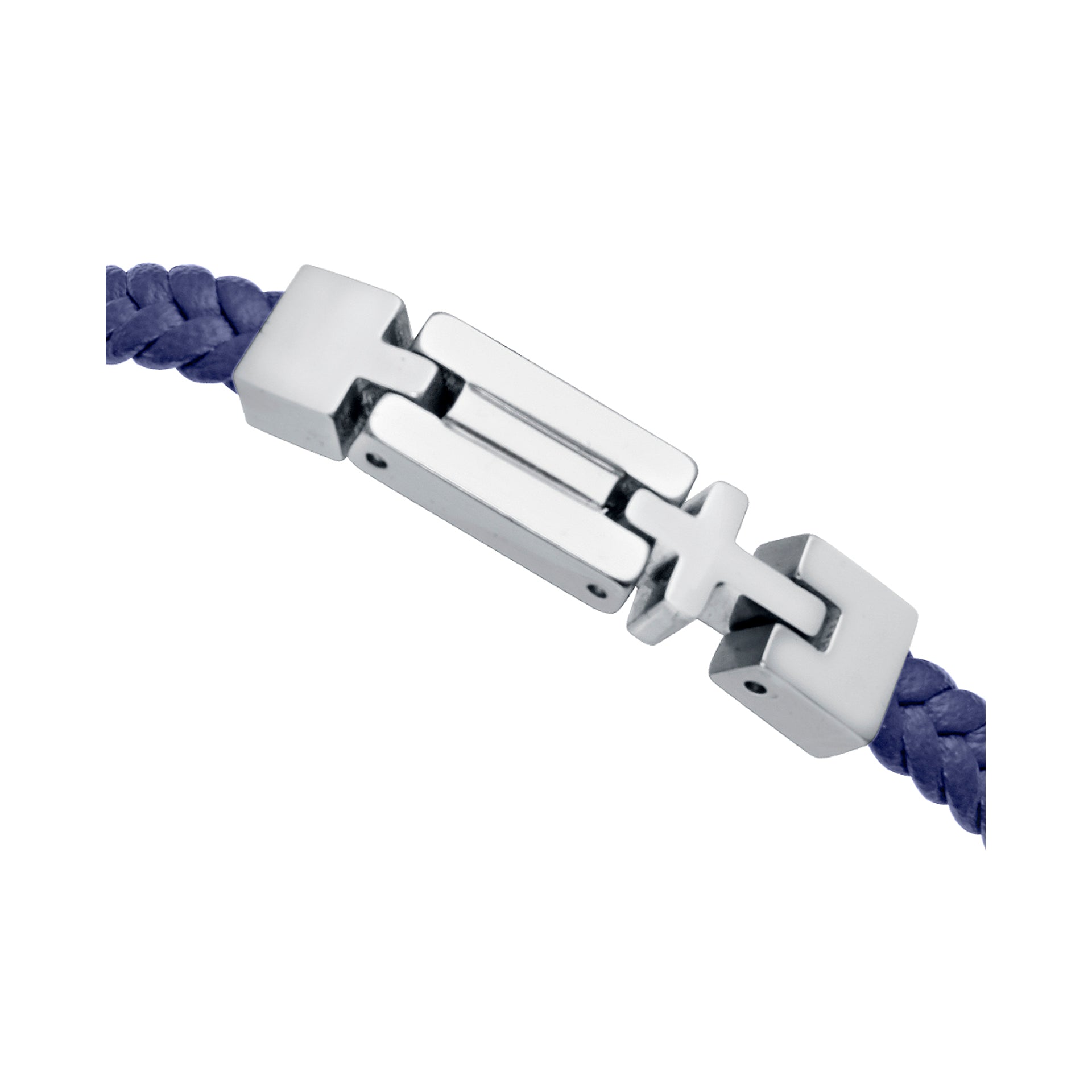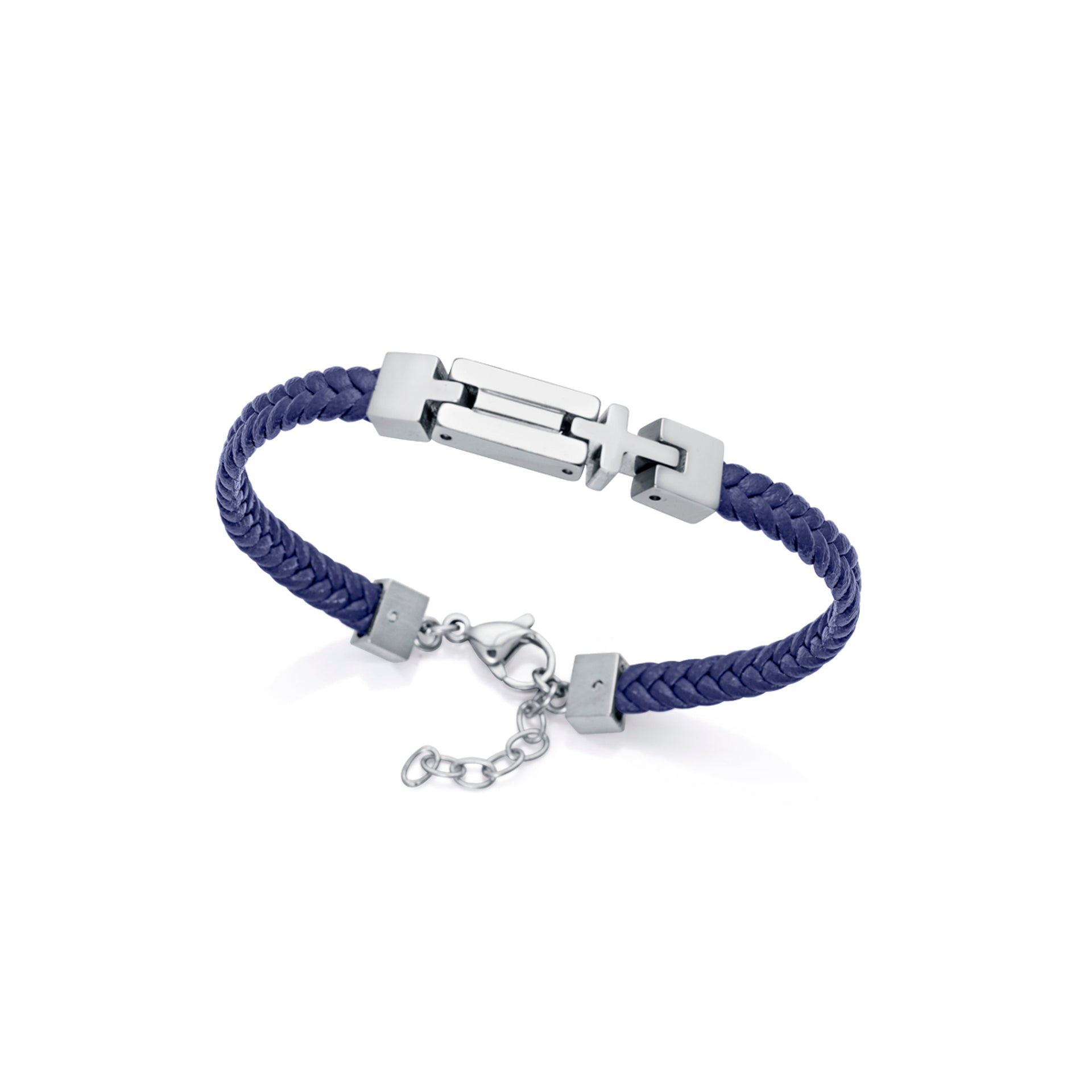 Bracciale da bambino in acciaio e pelle intrecciata blu con croce