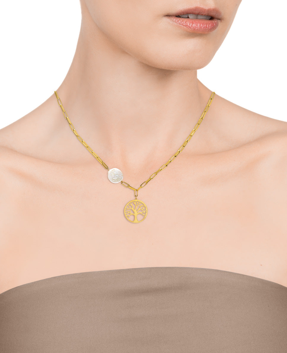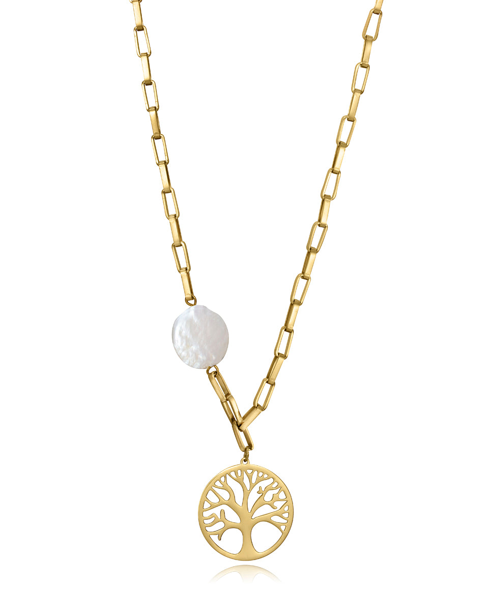 Collar Chic de acero dorado con motivo del árbol de la vida y perla