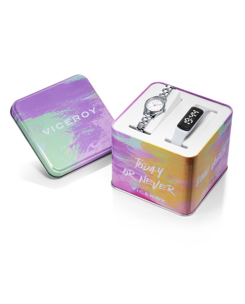 Pack de niña Sweet con reloj tres agujas caja y brazalete en acero y pulsera de actividad blanca