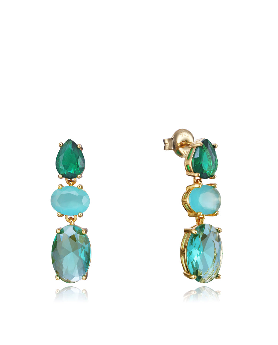 Eleganti orecchini in argento sterling placcato oro con cristalli verdi e blu
