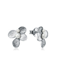 Pendientes Elegant de plata de ley rodiada en forma de hojas con perlas