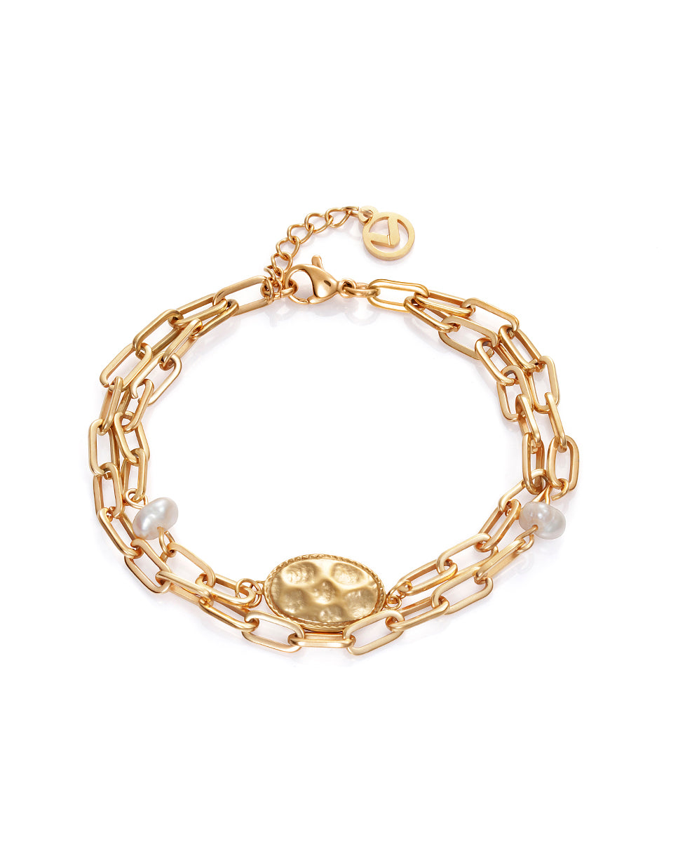 Pulsera Chic de acero IP dorado con disco ovalado martilleado y perla