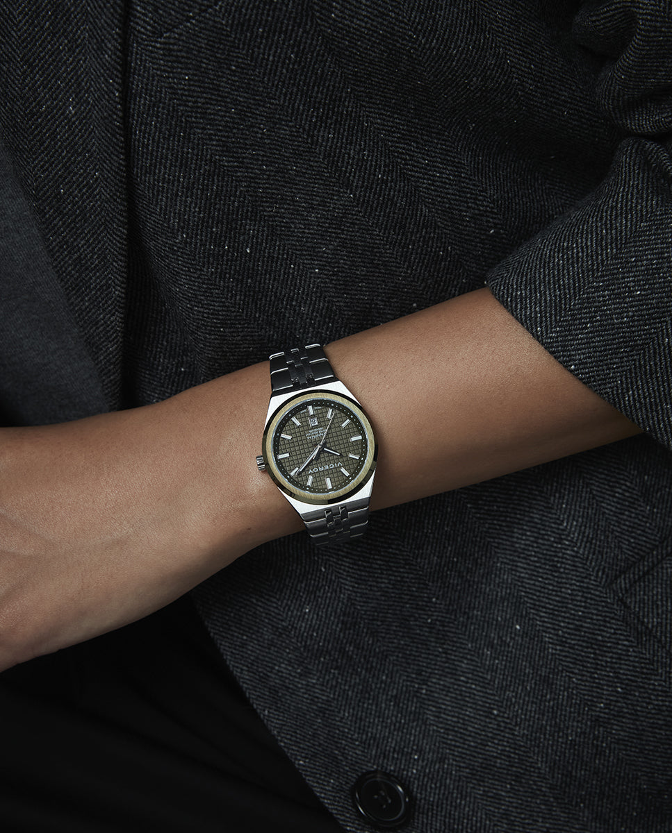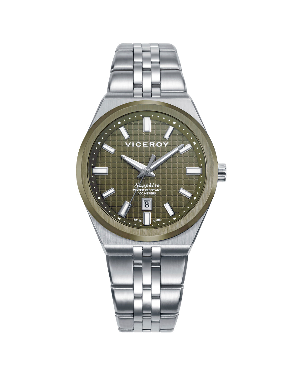 Reloj caja bitono de acero e Ip verde 10 Atm, brazalete de acero, movimiento cuarzo Suizo, Swiss made