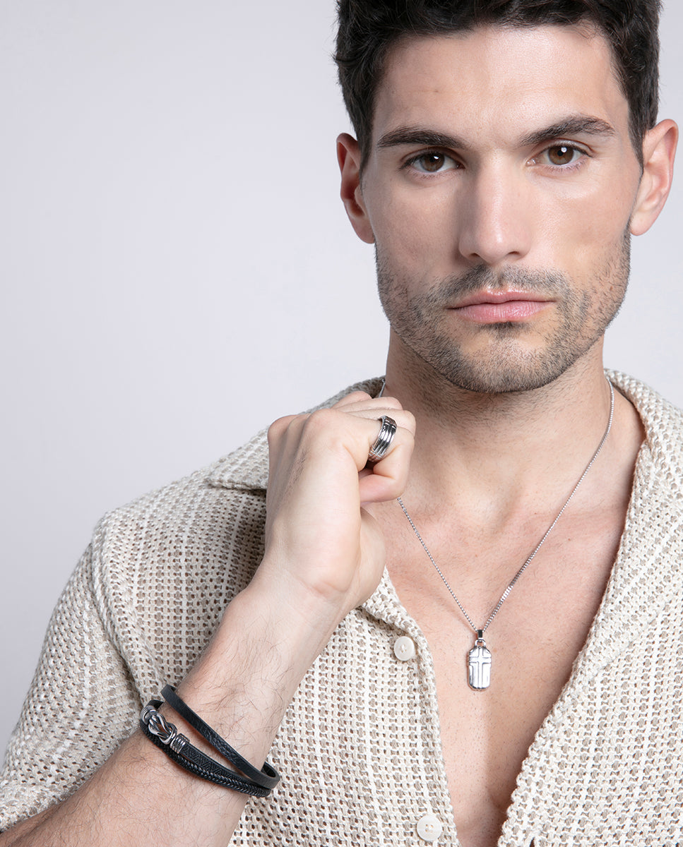 Límpiala con un paño especial para joyas o con un poco de agua templada con jabón neutro, evitando que la piel o el cordón entre en contacto con el agua.