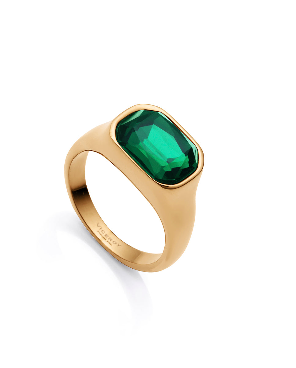 Anillo Chic de acero en Ip dorado tipo sello con cristal verde