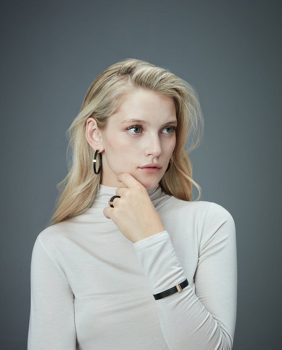 Anillo de mujer de acero Ip negro y dorado múltiples cables unidos con barra con circonitas
