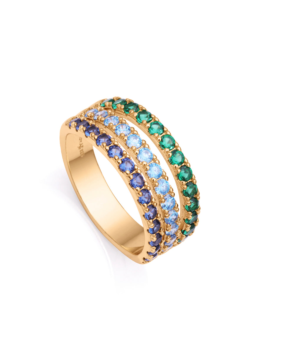 Anillo Elegant de plata de ley bañado en oro con circonitas en azul y verde