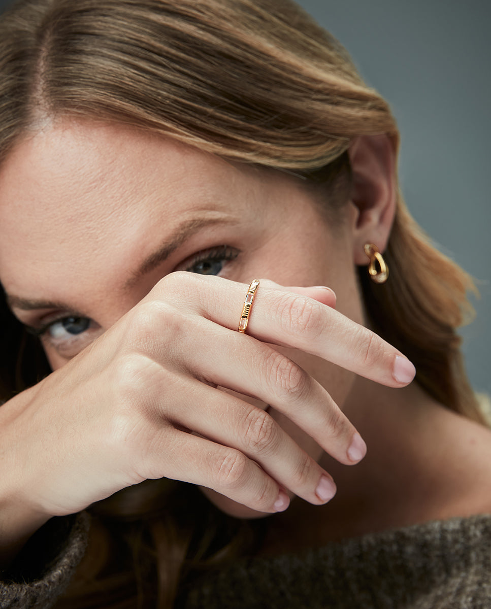 Anillo de plata de primera ley con baño de oro y cuatro circonitas baguette blancas