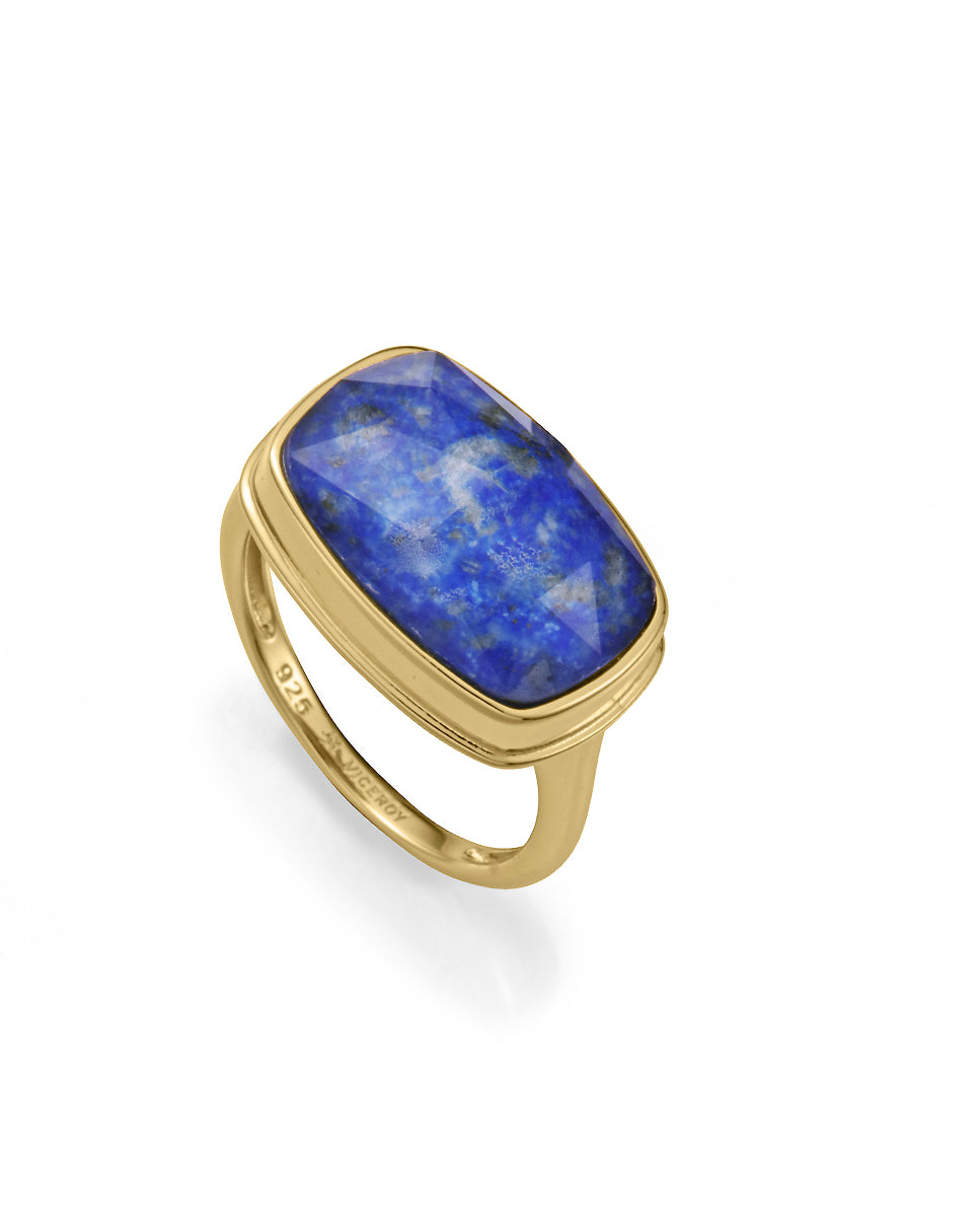 Anillo de plata de primera ley con baño de oro y piedra natural doblete lapiz lazuli y cristal