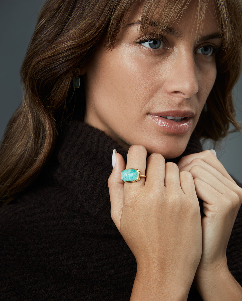 Anillo de plata de primera ley con baño de oro y piedra natural doblete amazonita y cristal