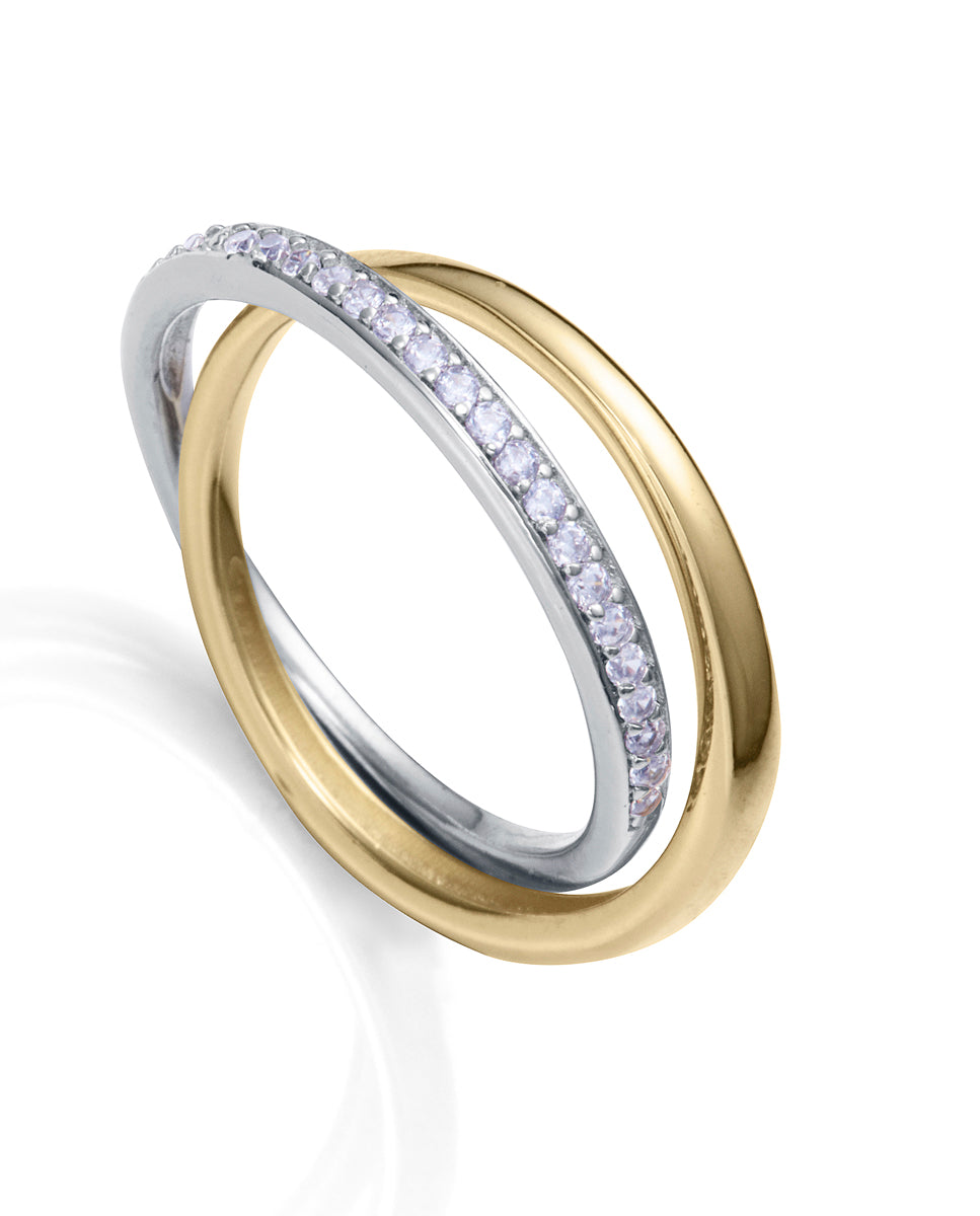 Anillo doble de plata de ley con baño de oro y rodio con fila de circonitas blancas