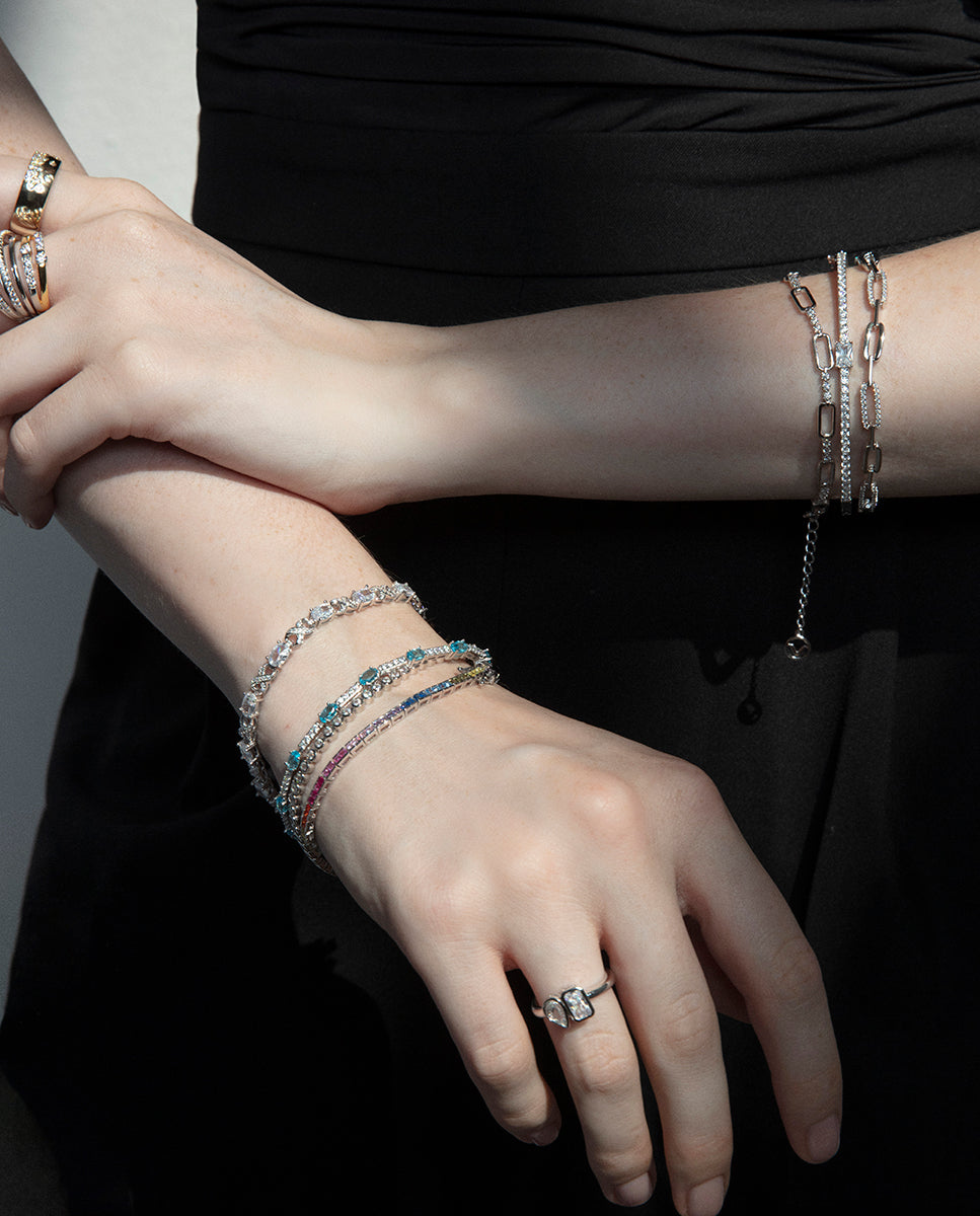 Evita el contacto directo con maquillaje, cremas o perfumes, así como el uso de líquidos abrillantadores y otros productos químicos, ya que podrían dañar el metal, la piel u otros elementos de la joya o reducir la duración del chapado.