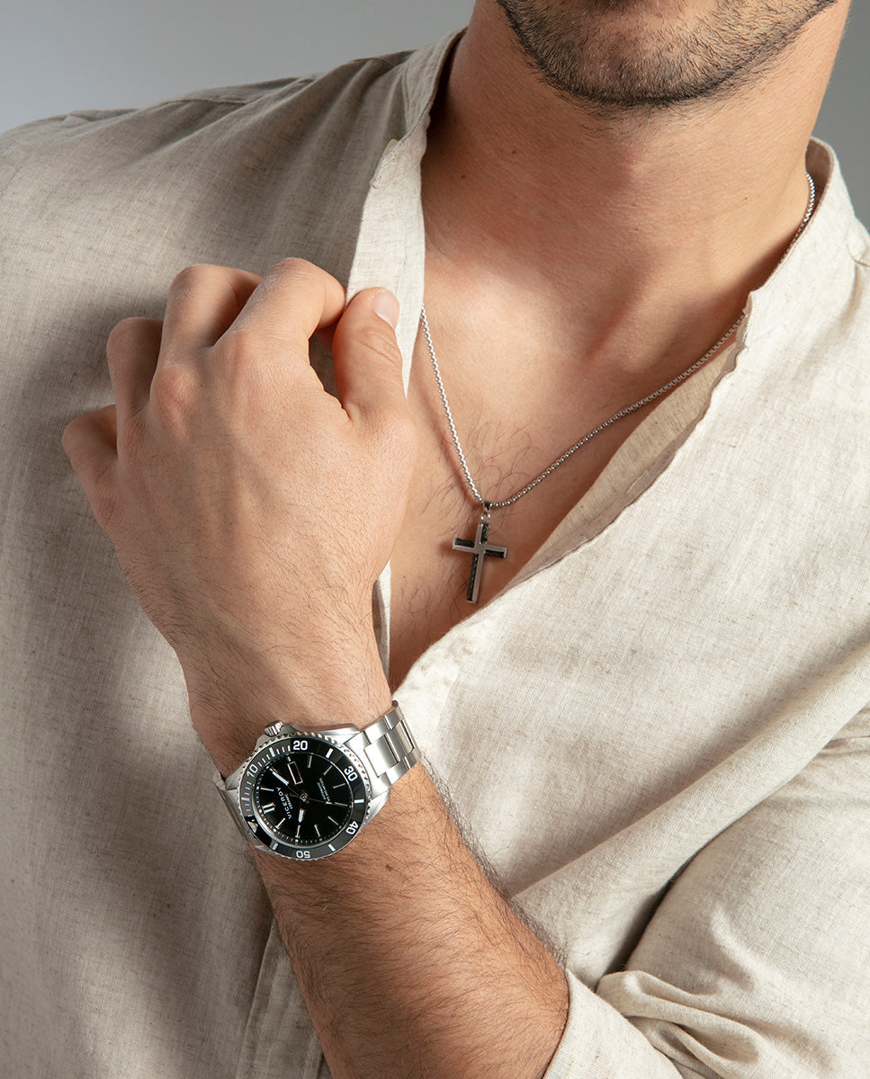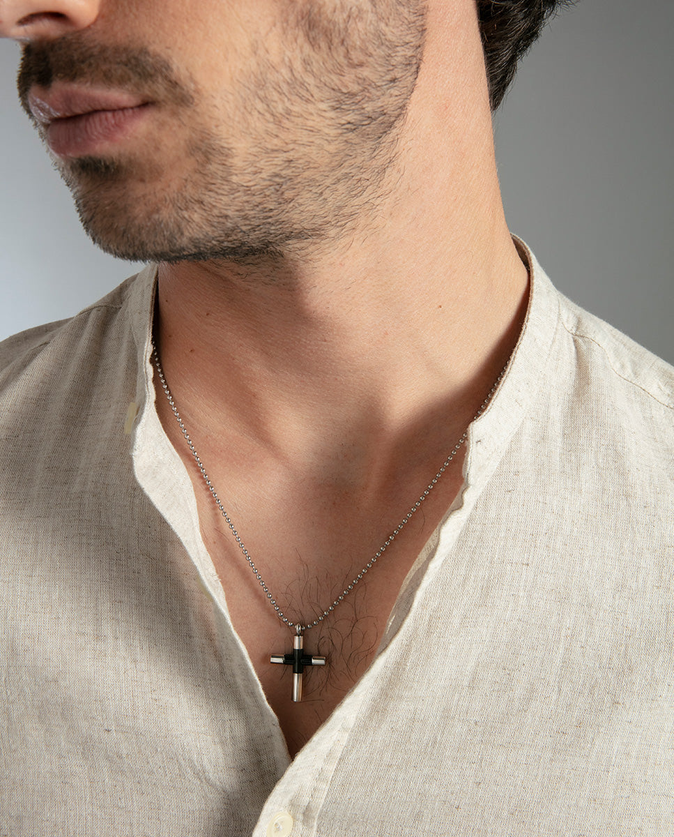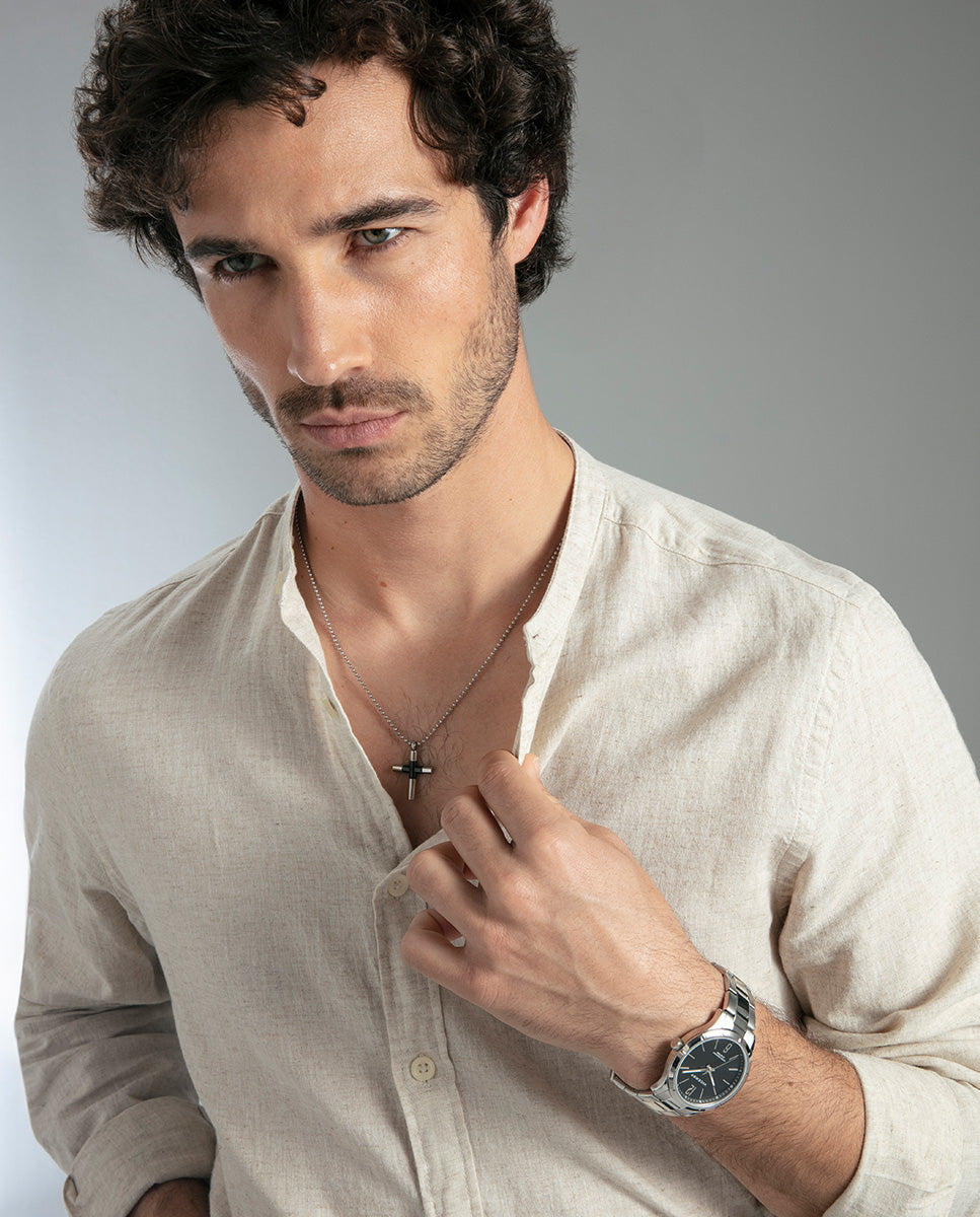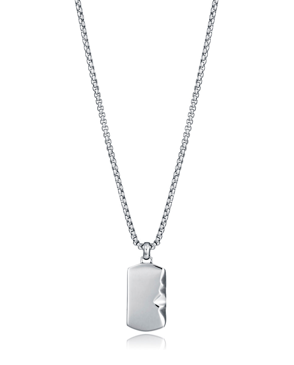 Collar de hombre en acero con placa colgante, una pieza de líneas limpias y presencia contemporánea que aporta carácter a cualquier look. Su acabado metálico y su diseño sobrio lo convierten en un complemento versátil, pensado para quienes buscan un estilo elegante con un toque actual. La cadena de 55 cm más 5 cm de extensión permite ajustar el largo con comodidad para llevarlo solo o combinado con otras piezasInformación del producto