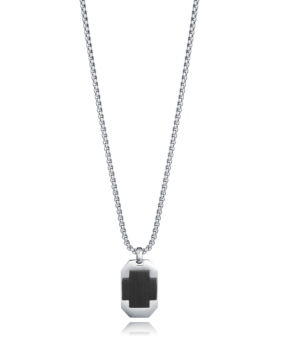 Collar de hombre de acero con placa y cruz en Ip negro. Largo 55 + 5 cm de extensión