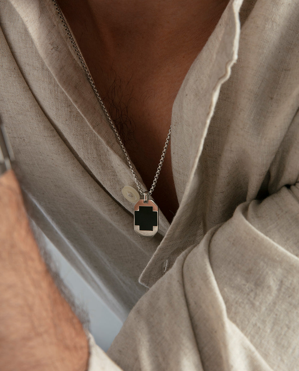Collar de hombre con placa y cruz, una propuesta de estética contemporánea que combina la fuerza del acero con el contraste sofisticado del Ip negro. Su diseño aporta presencia con un acabado sobrio y actual, ideal para elevar looks casuales o completar estilismos más cuidados con un gesto discreto y distintivo. Largo de 55 cm más 5 cm de extensión para adaptarse con comodidadInformación del producto