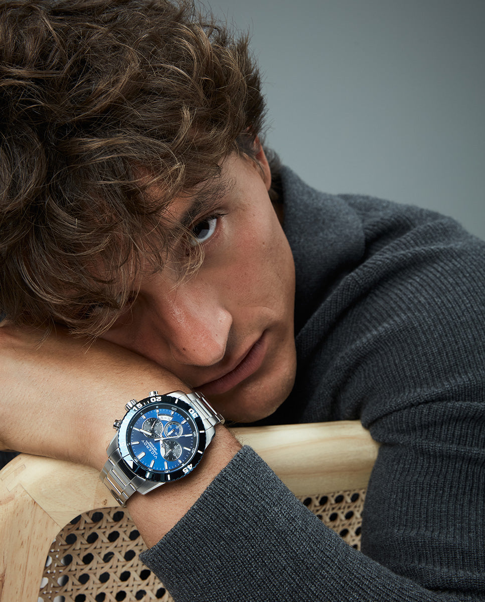 Reloj caja bitono de acero Ip azul 20 Atm,brazalete de acero, movimiento cuarzo