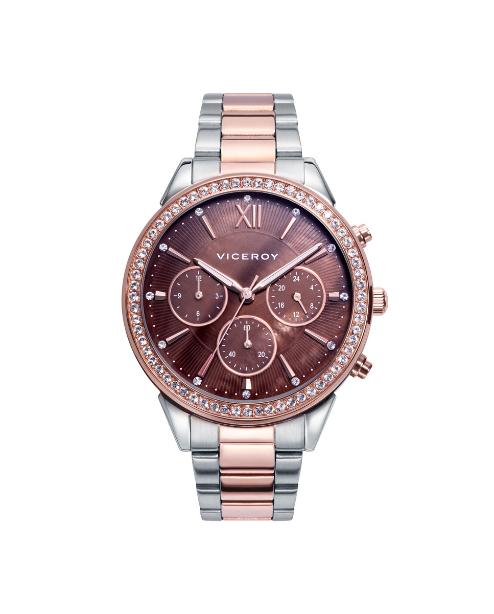 Reloj de mujer Chic de acero multifunción con esfera madreperla y bisel con circonitas