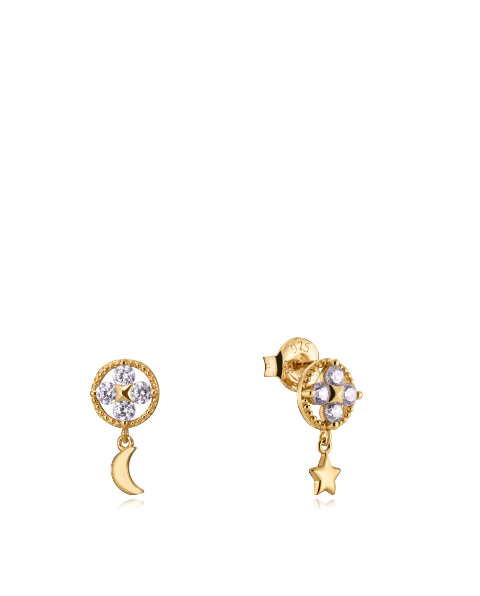 Pendientes Trend de plata de ley bañado en oro con circonitas blancas y colgantes de luna y estrella