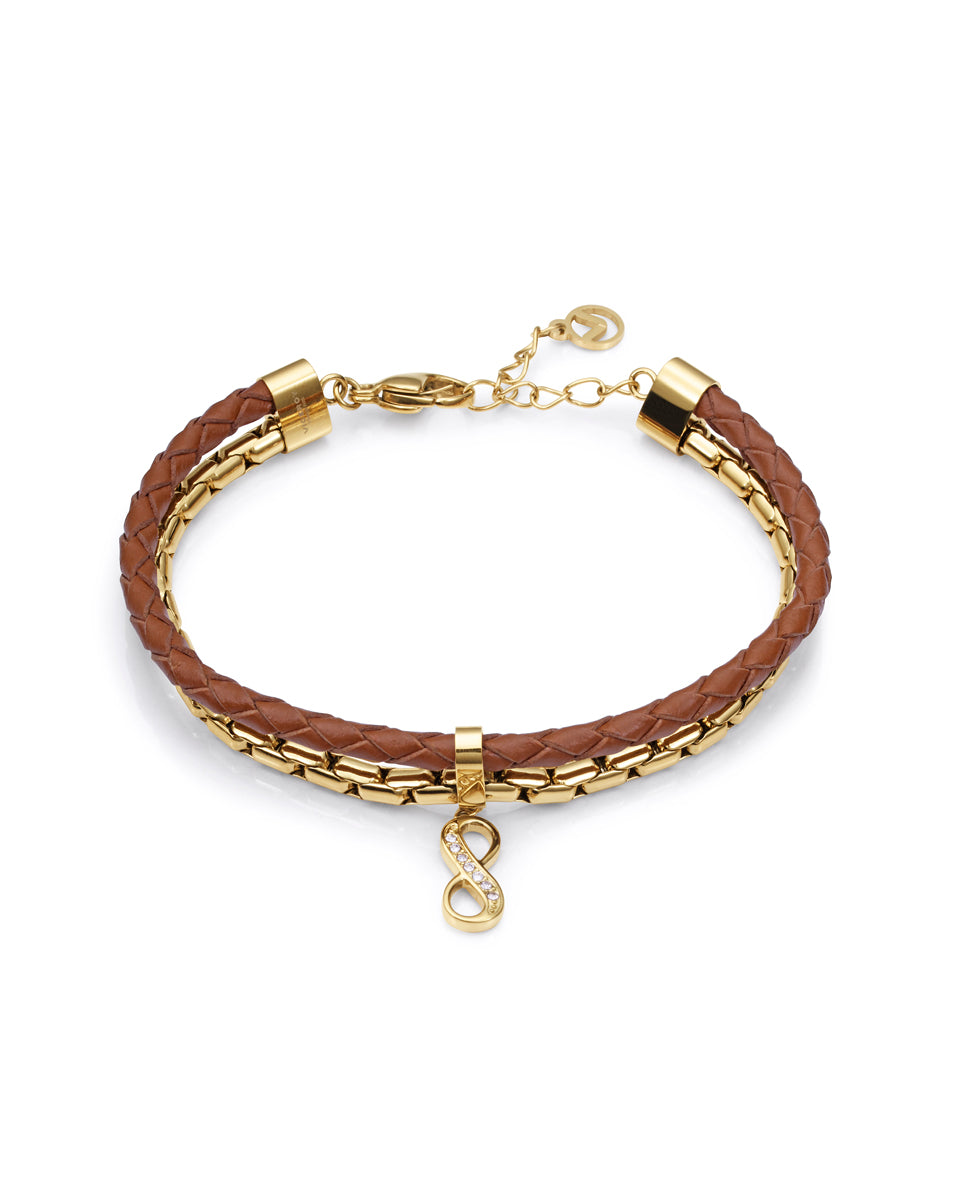 Pulsera Chic de acero en IP dorado con cuero trenzado en color marrón y motivo del infinito