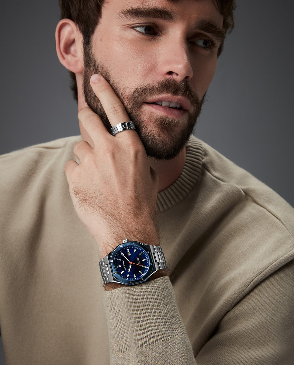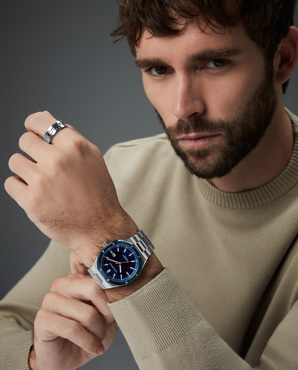 Reloj caja bitono de acero Ip azul 10 Atm, brazalete de acero, movimiento cuarzo