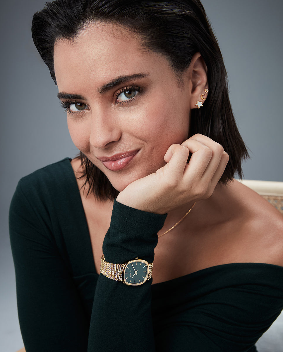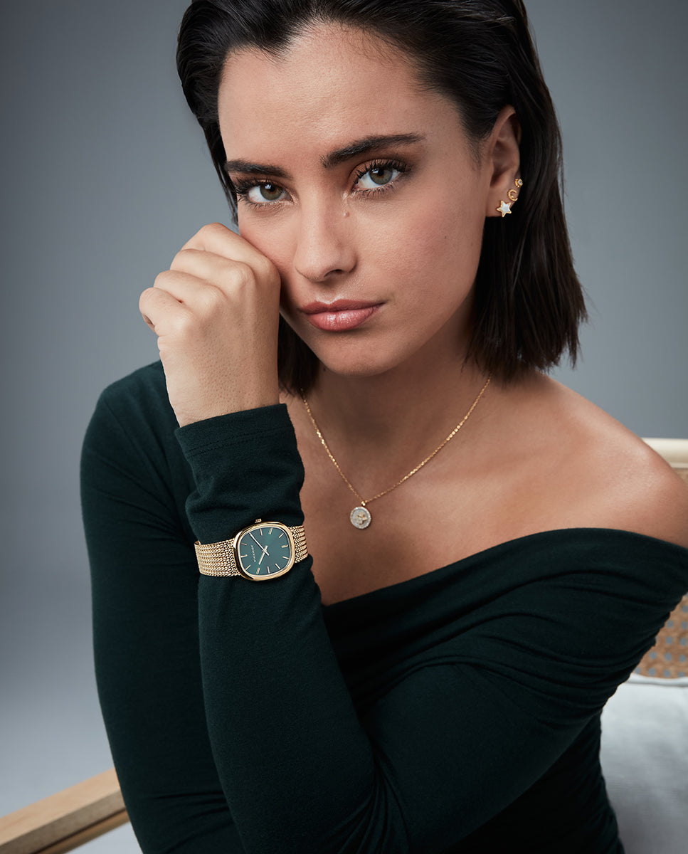 Reloj caja de acero Ip dorado, malla milanesa de acero Ip dorado, movimiento cuarzo
